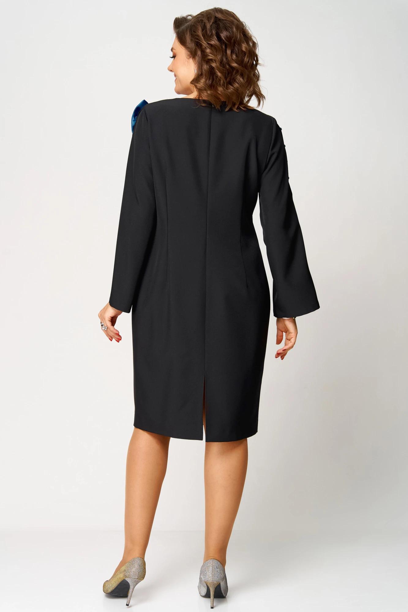 Платье женское полуприлегающего силуэта из костюмно-плательной ткани. Горловина округлой формы. Перед с нагрудными вытачками. Спинка с талиевыми вытачками, застежкой на молнию и разрезом в среднем шве. Рукав втачной прямой длинный с разрезом и декоративной застежкой на петли и пуговицы. По низу платья в боковом шве высокий разрез. Декорировано платье съемным бантом.