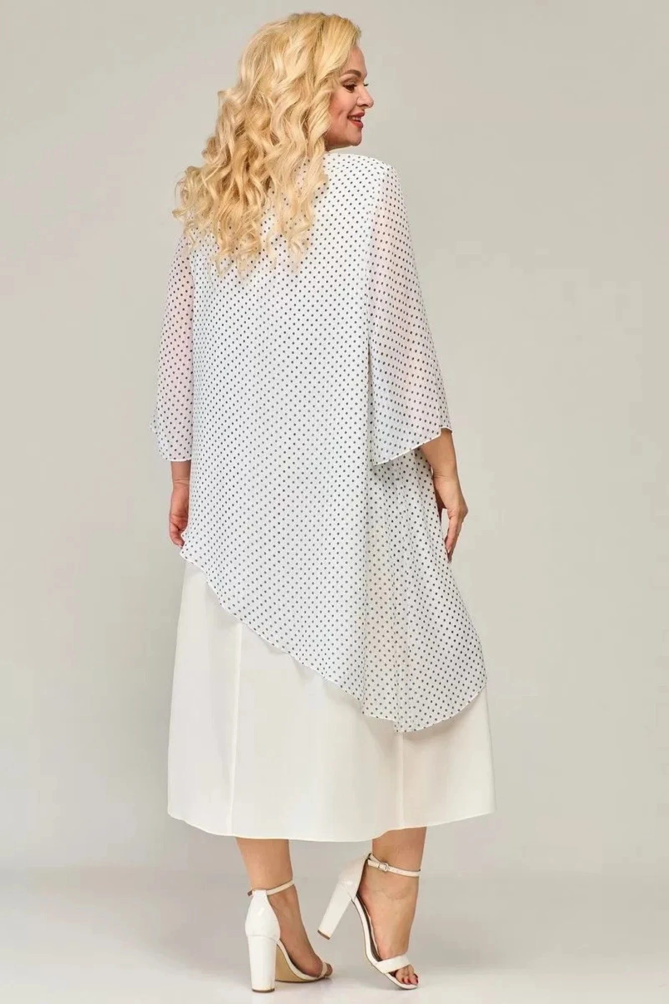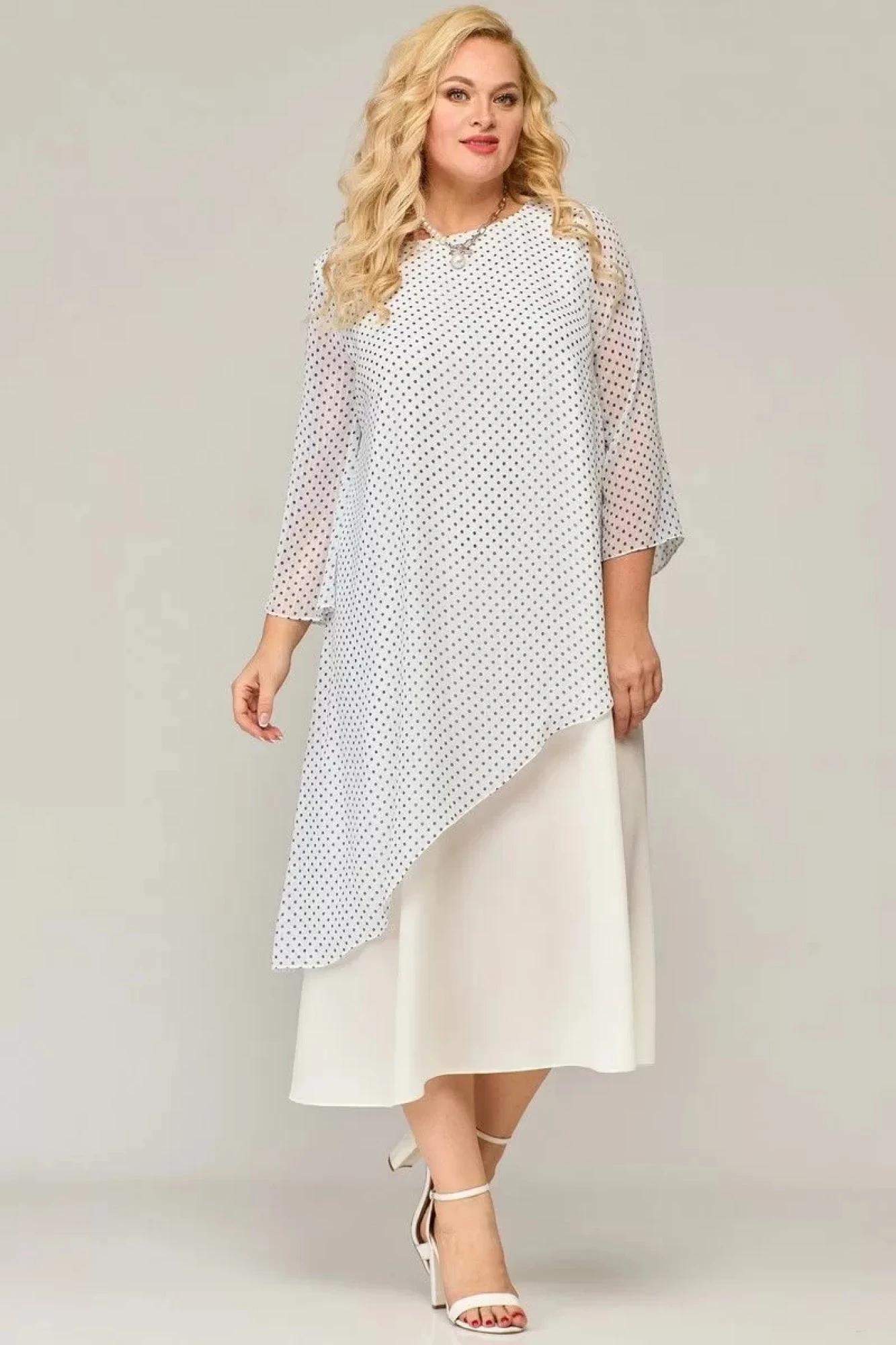 Двухслойное платье А-силуэта, длиной до середины икры. Горловина округлой формы, по спинке разрез и застежка на навесную петлю и пуговицу. Верхний слой по переду с нагрудными вытачками и ассиметричной линией низа. Нижний слой из однотонной ткани, по спинке со средним швом. Рукав втачной широкий, длиной ¾."