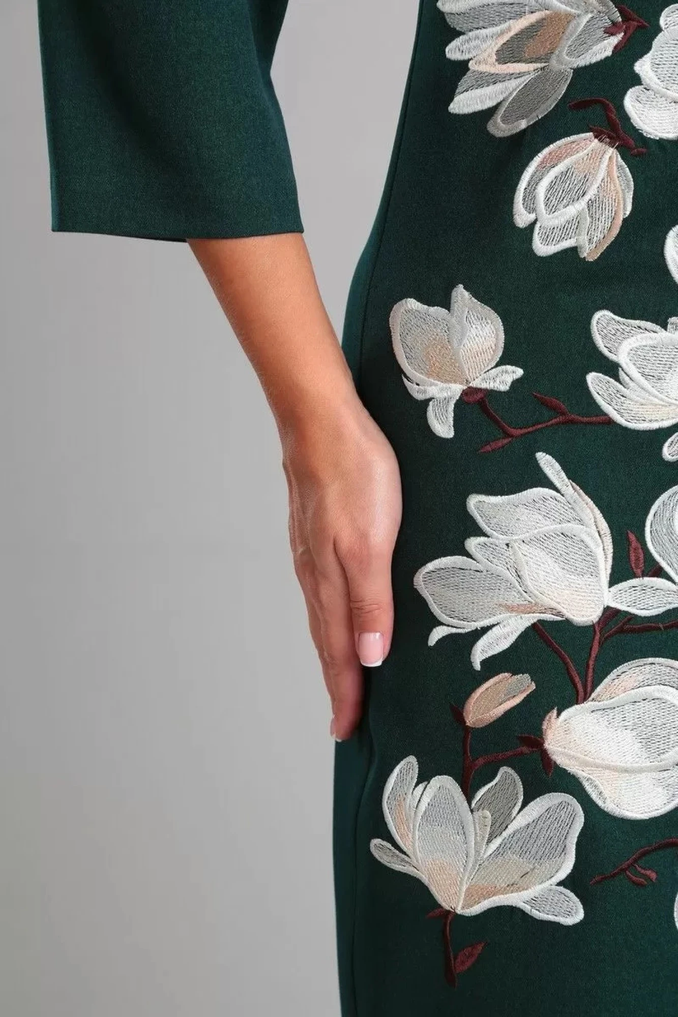 Классическое женское платье прекрасно подойдет на каждый день. На работе, на празднике Вы будете выглядеть элегантно и современно, изящно и строго. Платье приталенного силуэта, с округлым вырезом горловины. По переду платья декоративная вышивка и нагрудные вытачки. Спинка с талиевыми вытачками, средним швом и застежкой молнией сверху. Рукав втачной, длиной 3/4.