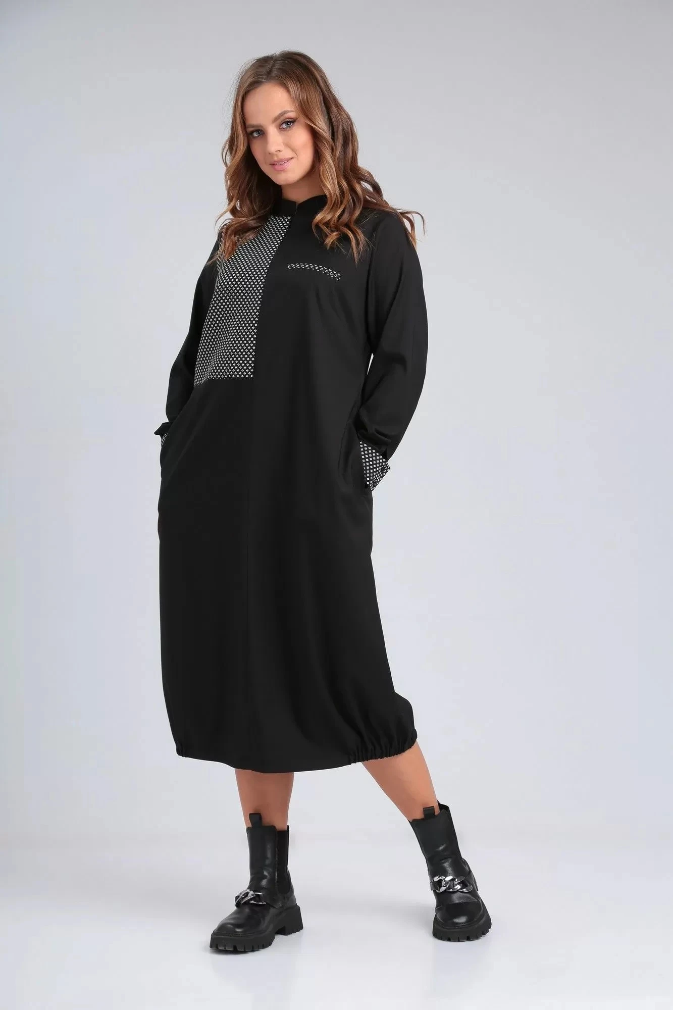 Платье свободного силуэта из костюмно-плательной ткани. Горловина округлой формы со стойкой. Перед платья с застежкой на молнию в среднем шве, нагрудными вытачками, подрезом и карманом-обманкой из отделочной ткани. Спинка со средним швом, подрезом из отделочной ткани и декоративной нашивкой. В боковых швах глубокие функциональные карманы. Рукав втачной длинный, по низу декоративная манжета с застежкой на петлю и пуговицу. По низу платья по бокам вставлены резинки."