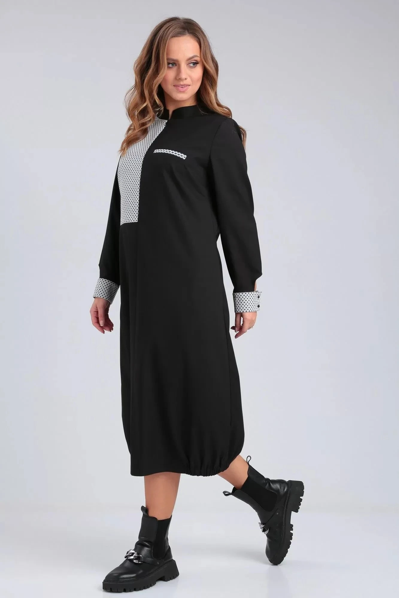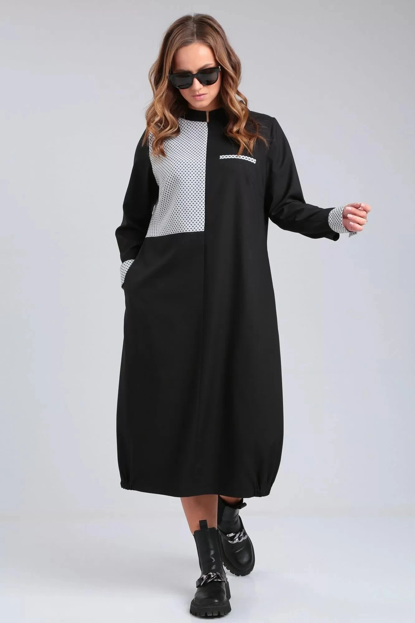 Платье свободного силуэта из костюмно-плательной ткани. Горловина округлой формы со стойкой. Перед платья с застежкой на молнию в среднем шве, нагрудными вытачками, подрезом и карманом-обманкой из отделочной ткани. Спинка со средним швом, подрезом из отделочной ткани и декоративной нашивкой. В боковых швах глубокие функциональные карманы. Рукав втачной длинный, по низу декоративная манжета с застежкой на петлю и пуговицу. По низу платья по бокам вставлены резинки.