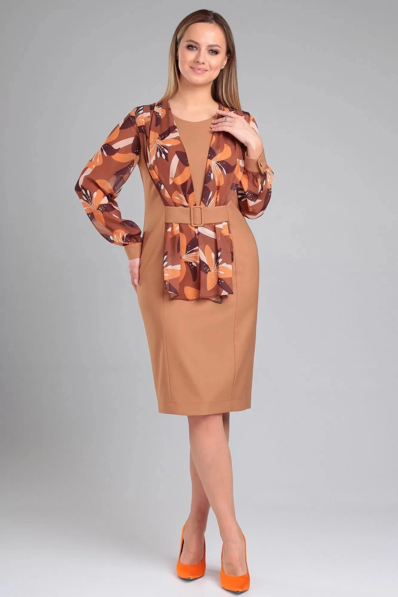 Платье женское полуприлегающего силуэта. Горловина полукруглой формы, обработана обтачкой. Перед с рельефными швами. В плечевых швах переда расположен декоративный шарфик. По линии талии в центральной части переда расположен декоративный пояс с пряжкой. Спинка с рельефными швами и средним швом, в котором расположена застежка на потайную молнию и шлица. Рукав втачной длинный, на манжете с застежкой на петлю и пуговицу.