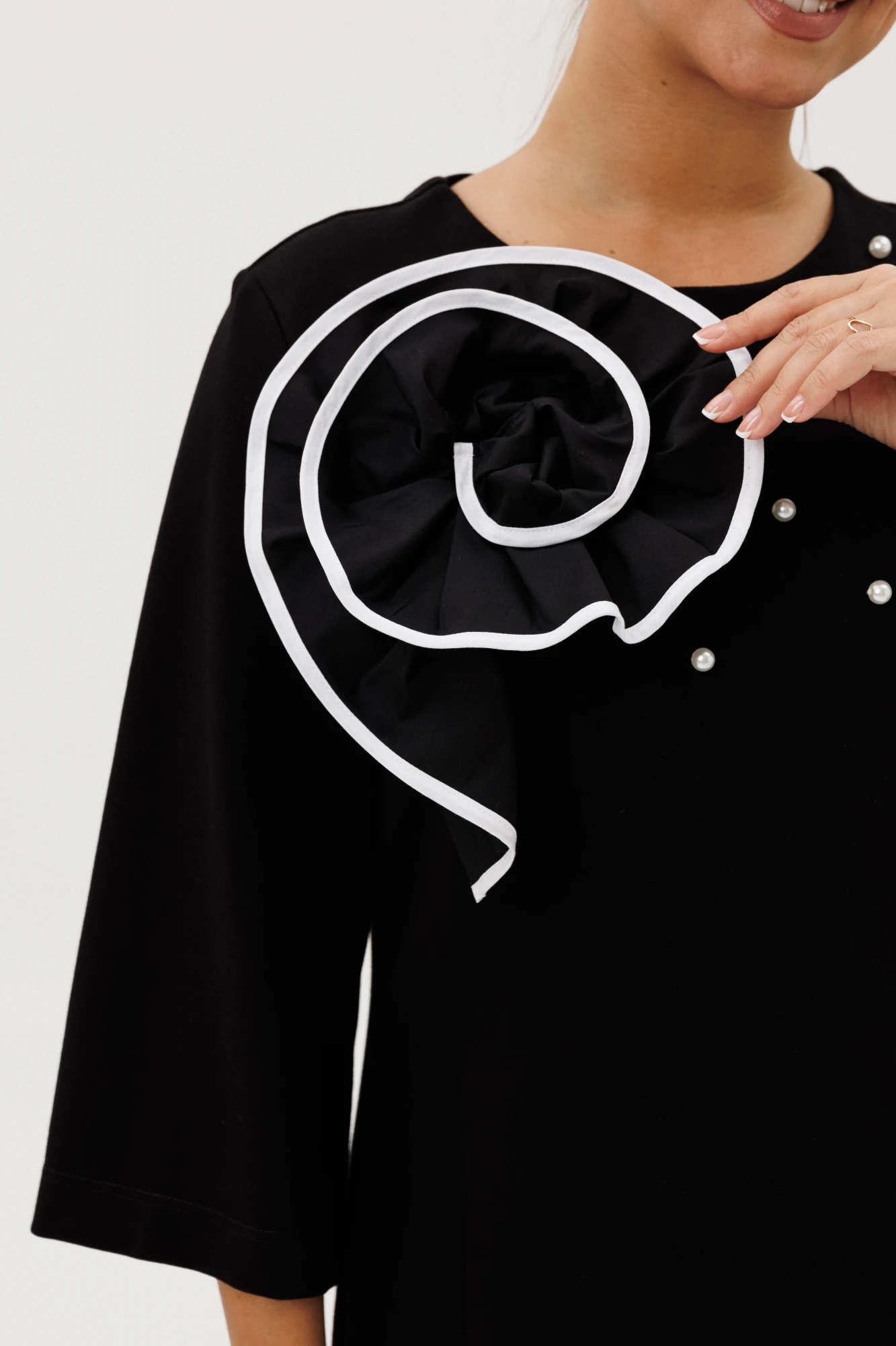 Платье трикотажное прямого силуэта умеренного объема. Вырез горловины округлый, по спинке застежка на потайную молнию, рукав 3/4 рубашечного покроя.