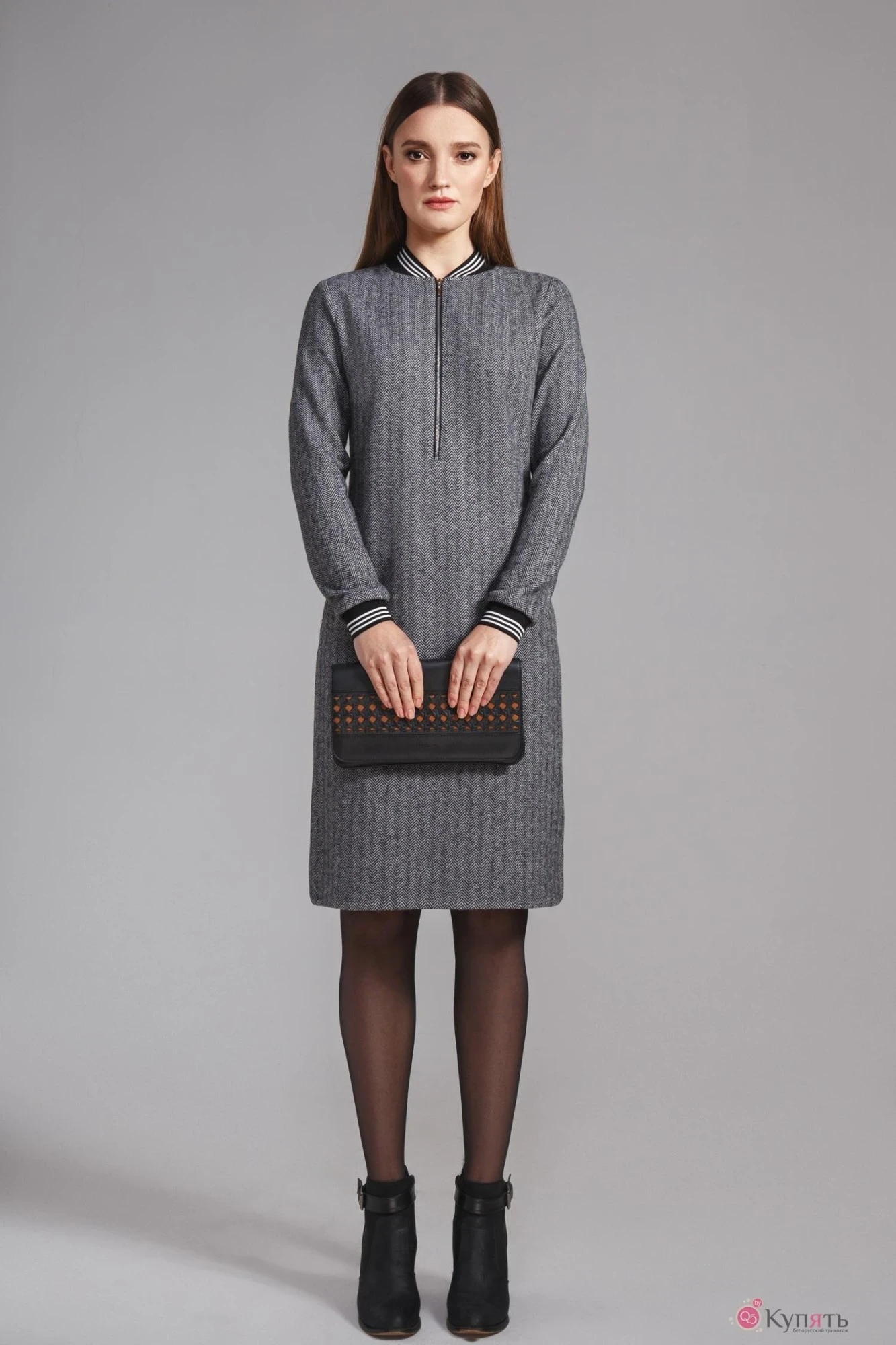 Платье прямого силуэта из трикотажного полотна с длинными рукавами, карманами в боковых швах и застежкой спереди на металлическую молнию 30 см. Манжеты и воротник имеют контрастный довяз.