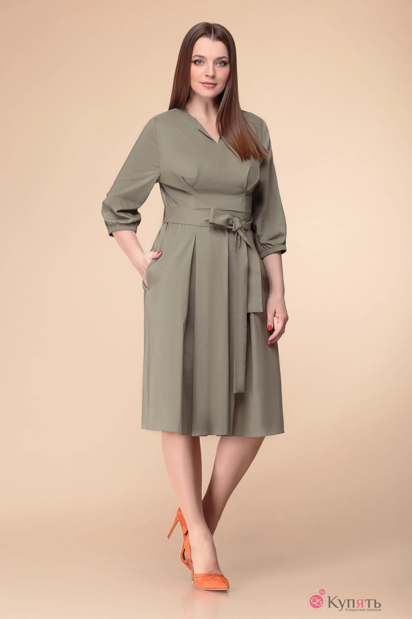 Платье из текстильного полотна отрезное по талии с V образным вырезом, рукавами длиной 3/4 на резинке, встречными складками, карманами в боковых швах, поясом из того же полотна и застежкой по спинке на потайную молнию 60 см.