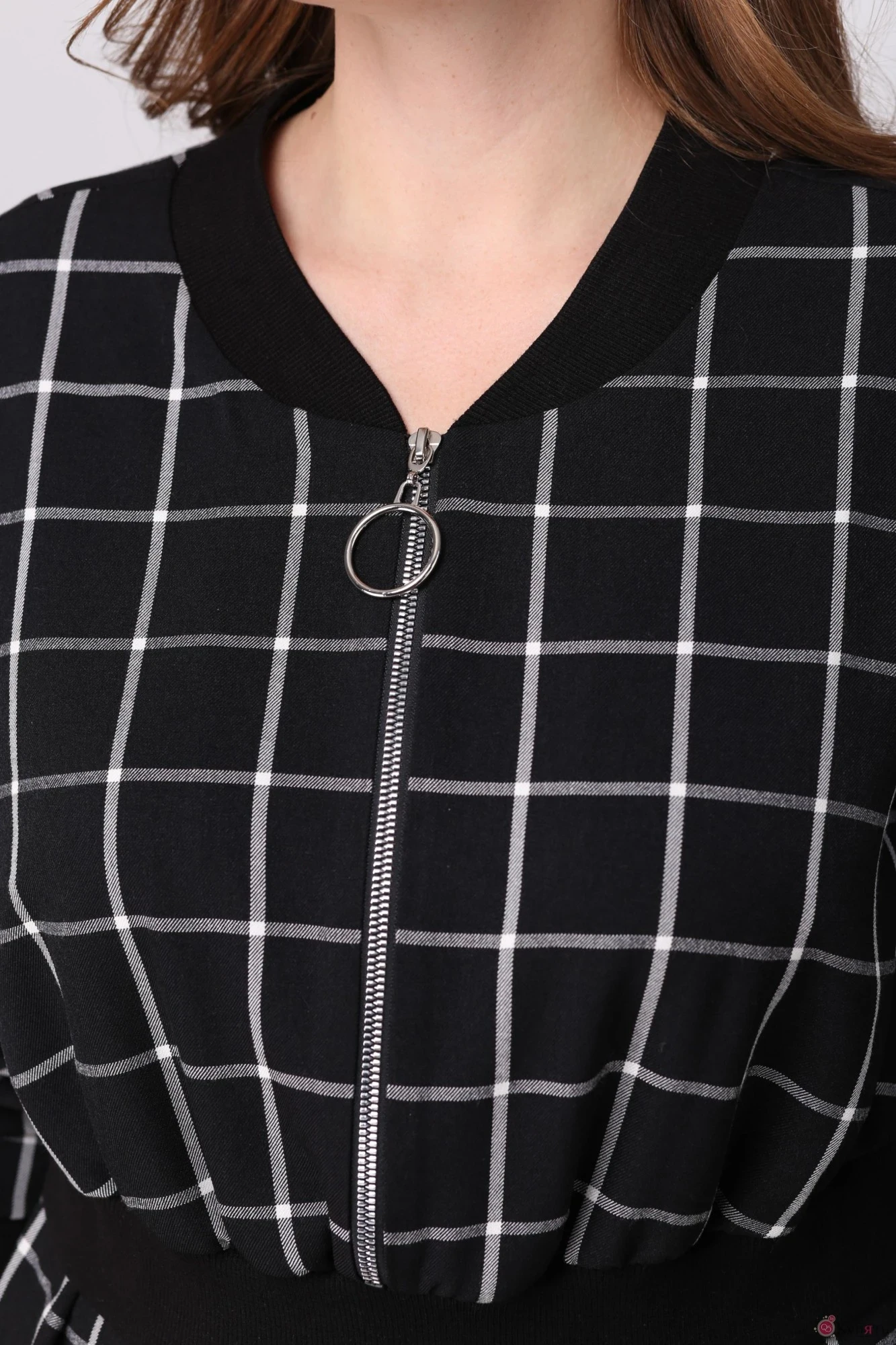 Женское платье, выполнено из плательно-костюмной ткани. Горловина округлой формы. По лифу молния, идущая до талии. Рукав со спущенной линией втачивания. Воротник, манжета по талии и рукавам выполнены из довязов. В боковых швах обработаны функциональные карманы.