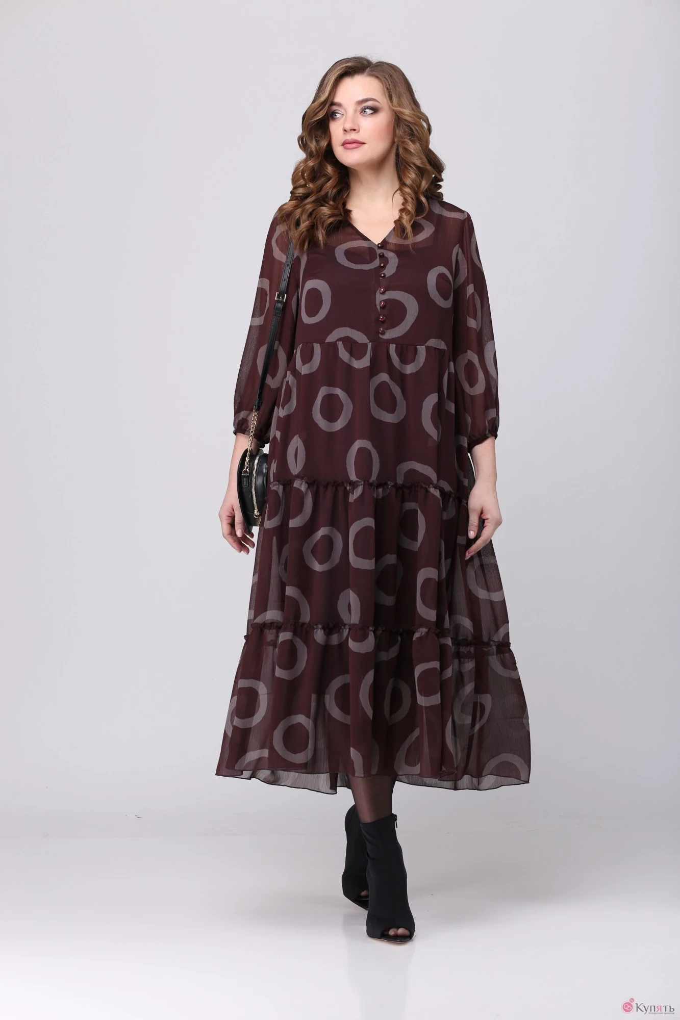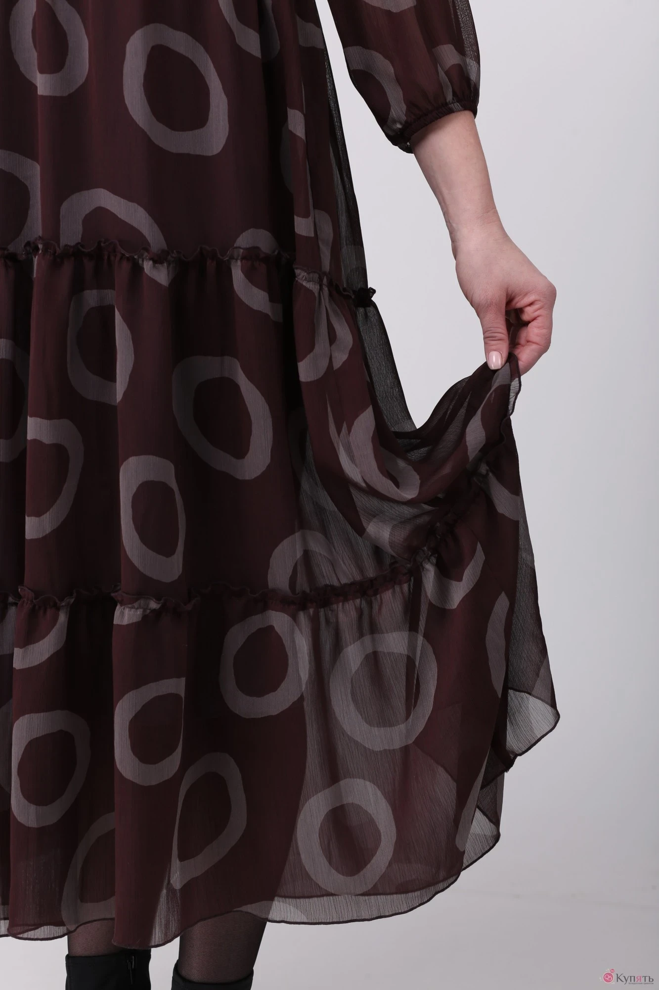 Оригинальное платье из шифоновой ткани с принтом "кольца", свободного силуэта с подрезом в области линии талии со сборкой и двумя ярусами воланов от него. Перед с V-образны вырезом и имитацией центральной застежки на лифе на навесные петли и пуговицы. Рукава втачные, длина - 3/4, собраны на резинку по низу. Нижнее платье на бретелях полуприлегающего силуэта, выполнено из трикотажного полотна.