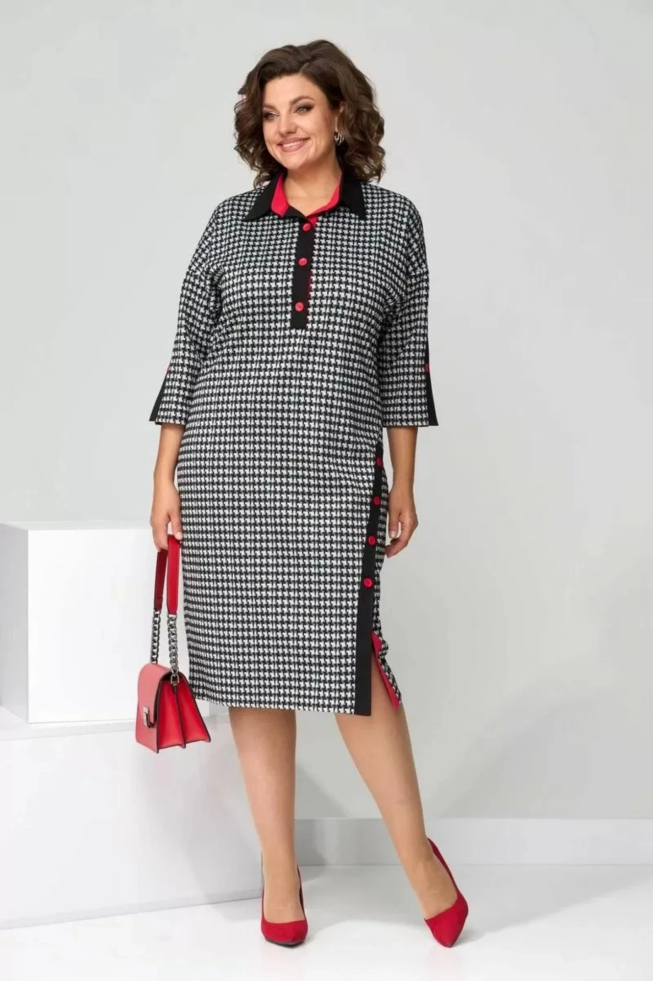 Трикотажное женское платье больших размеров Асолия. Платье женское полуприлегающего силуэта, с рукавом покроя "летучая мышь". По рукаву подрез ниже линии плеча. Из-под подреза по рукаву планка на пуговицы. Воротник мужской на стойке. По центру переда застёжка на планку с пуговицами до линии уровня груди. По переду ассиметричная фигурная планка, застёгивающаяся на пуговицы. Планка расположена от уровня выше бедра по боковому шву и до низа платья. Спинка с отделочной вставкой по центральной линии. Платье выполнено из трикотажа и двух видов отделочных тканей.