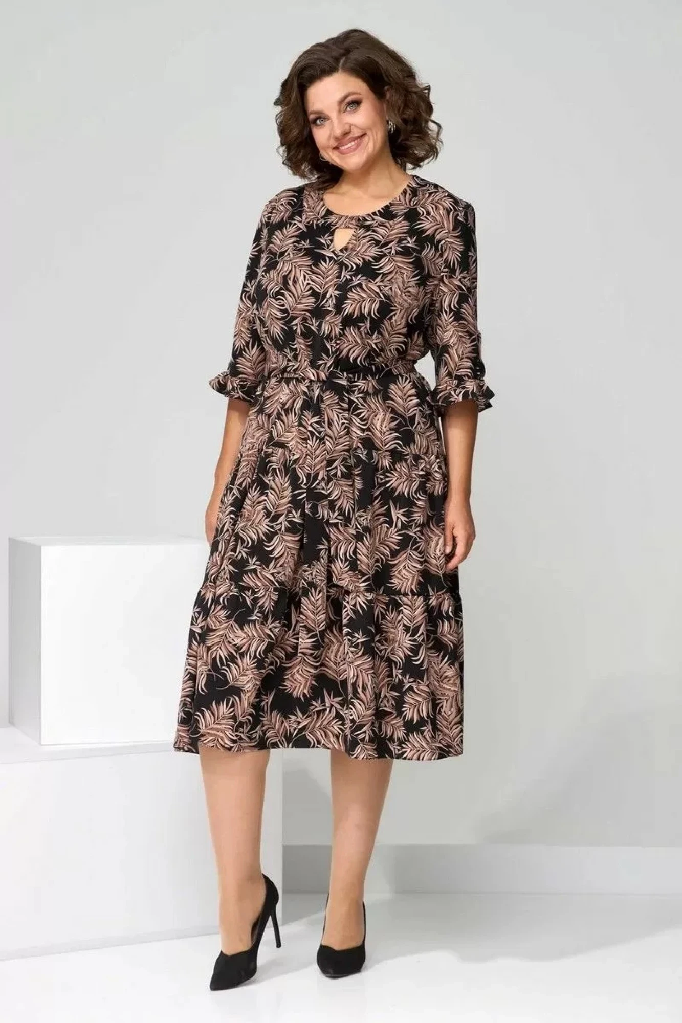 Платье женское свободного силуэта, выполнено из шифона на трикотажной подкладке. Горловина округлая, на планке с капелькой. Рукав 3/4 с присборенными воланами и окантованным каплевидным разрезом. По переду нагрудные вытачки, по спинке застёжка на капельку с петлёй и пуговицей. Платье отрезное по линии бёдер. Юбка платья состоит из двух рядов присборенных воланов. К платью прилагается пояс.