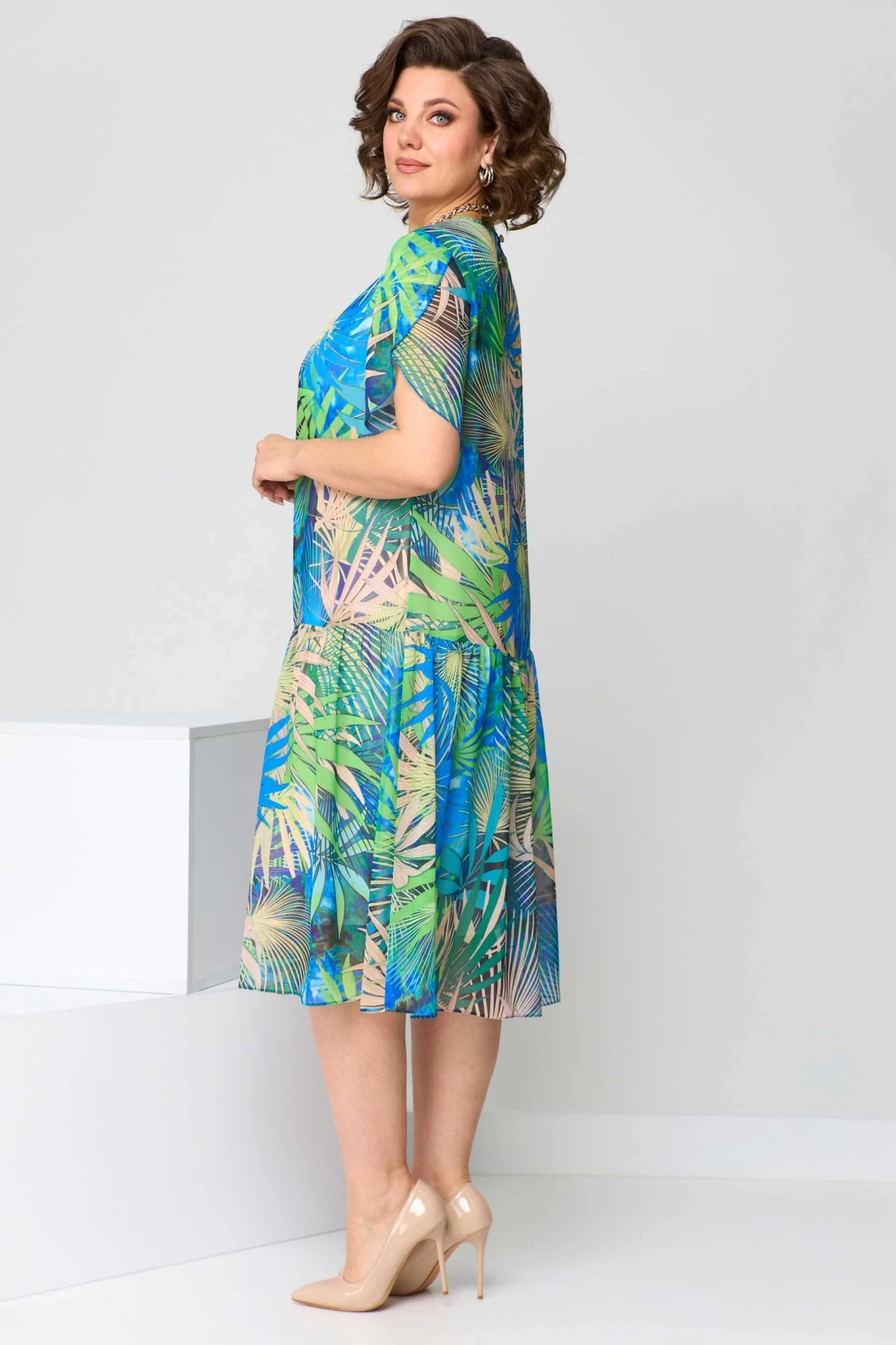 Платье женское нарядно-повседневное, свободного силуэта, выполнено из шифона. Горловина фигурная "на окантовке", с разрезом "капелькой" и складками. Рукав короткий, состоит из двух половинок, заходящих друг на друга. Платье с воланом по низу. Волан от уровня бедра. Спинка свободная. Застежка на "капельку", на петлю с пуговицей.