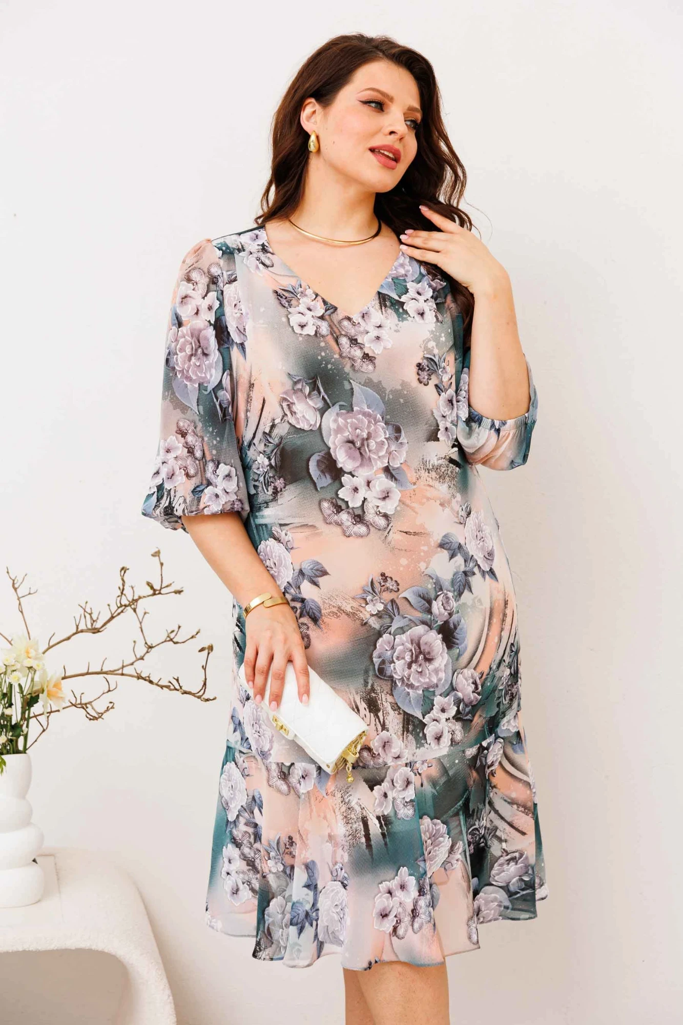 Платье женское свободного силуэта из плательной ткани. Рукав три четверти, силуэт свободный. Горловина V-образная. Перед с кокеткой, из-под которых две складки. Рукав присборен по окату, расширен на резинку по низу. Спинка свободная. По низу платья клешеный волан