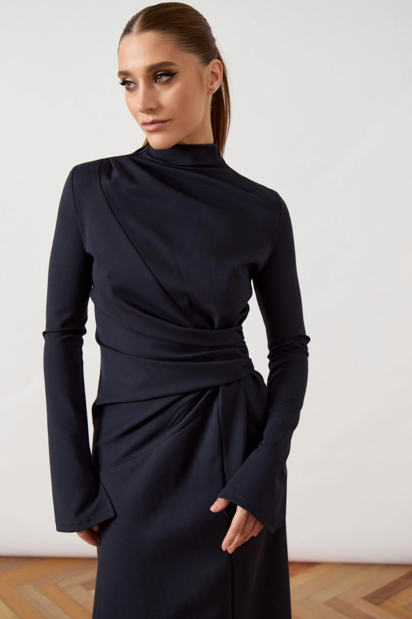 Платье женское приталенного силуэта длины макси, выполнено из плотного трикотажного полотна. Изделие с высоким воротником-стойкой и длинным втачным рукавом с закрытой проймой. Ключевой конструктивной особенностью модели является сложная драпировка на переднем полотнище, создающая эффект асимметричных складок, сходящихся к линии талии. Спинка платья с талиевыми вытачками и застежкой на потайную молнию. Нижний край изделия оформлен с выраженной асимметрией, где правая сторона платья длиннее левой, образуя мягкий диагональный срез. Линия низа обработана узким плоским швом.