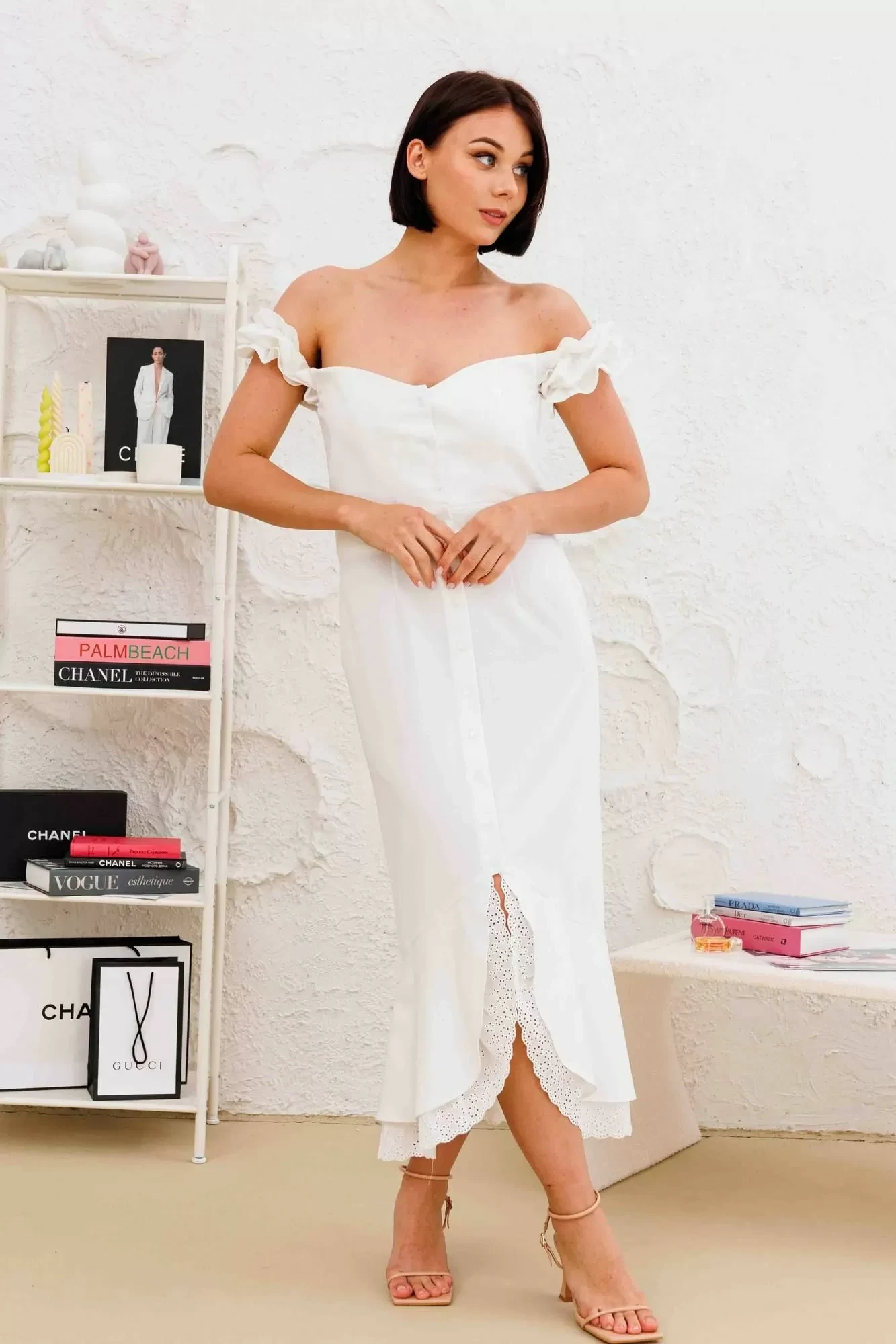 платье в длие миди. застежка - пуговицы по центру переда.. силуэт приталенный. низ платья декорирован кружевом, срез закругленный. рукава оформлены в виде бретелей на резинке, надеть можно как на плечи, так и а предплечья.