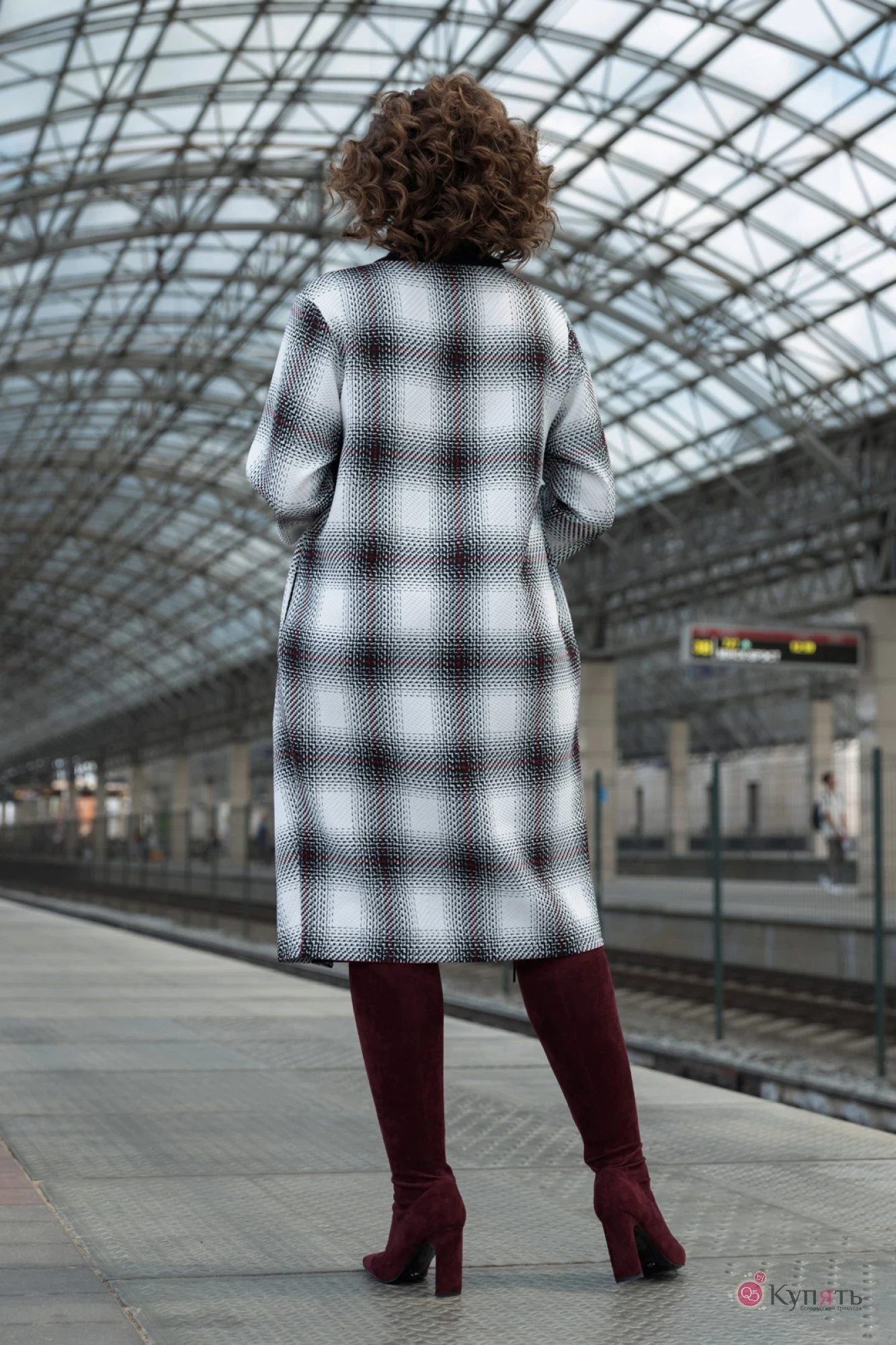 Платье полуприлегающего силуэта из плотной костюмно-плательной ткани. В боковых швах удобные карманы, на переде имитация застежки. Горловина и вставка по переду из мягкого трикотажа. В 50-52-54 размерах длина изделия 102 см, в 56-58-60 105 см. Длина рукава 42 и 44 см соответственно.