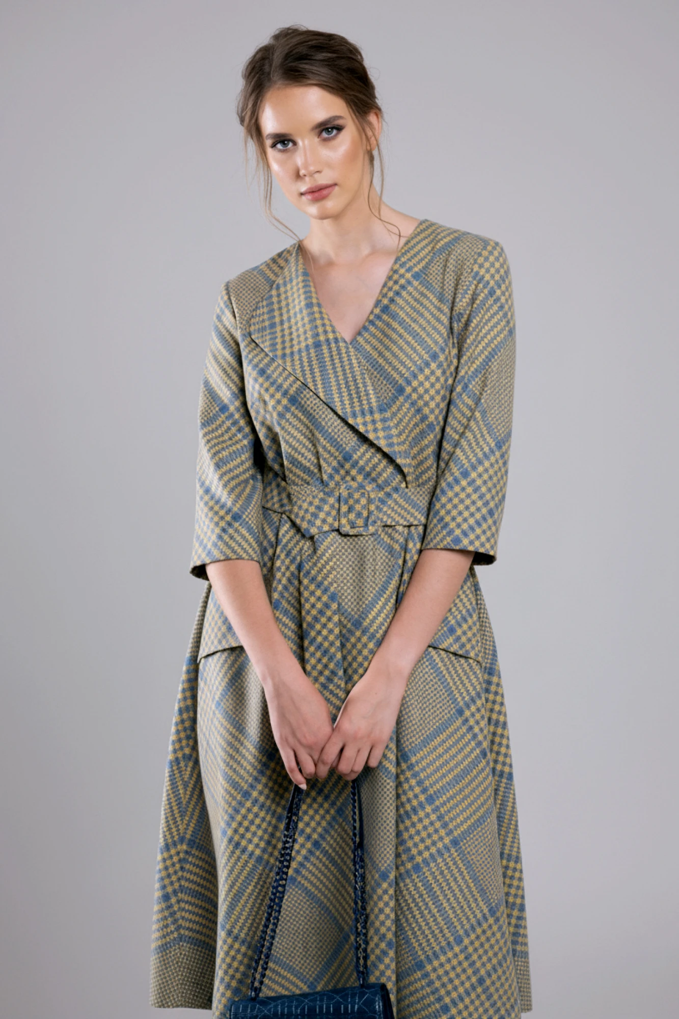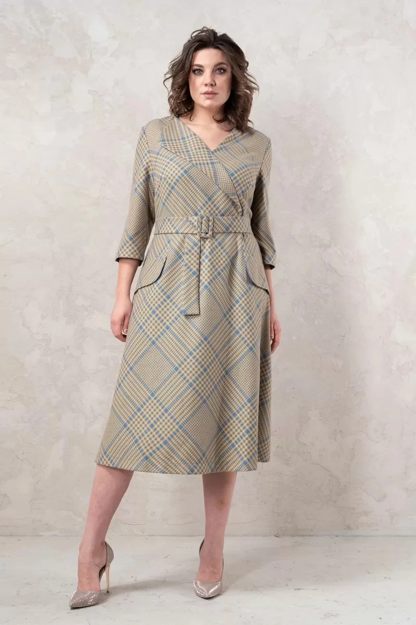 Элегантное платье полуприлегающего силуэта из костюмно-плательной ткани средней плотности. Ткань мягкая, приятная на ощупь. В среднем шве спинки молния. На переде имитация карманов. Внутренние швы окантованы. Рукав втачной, длина рукава 43 см. Пояс съемный. Длина по спинке 113 см.