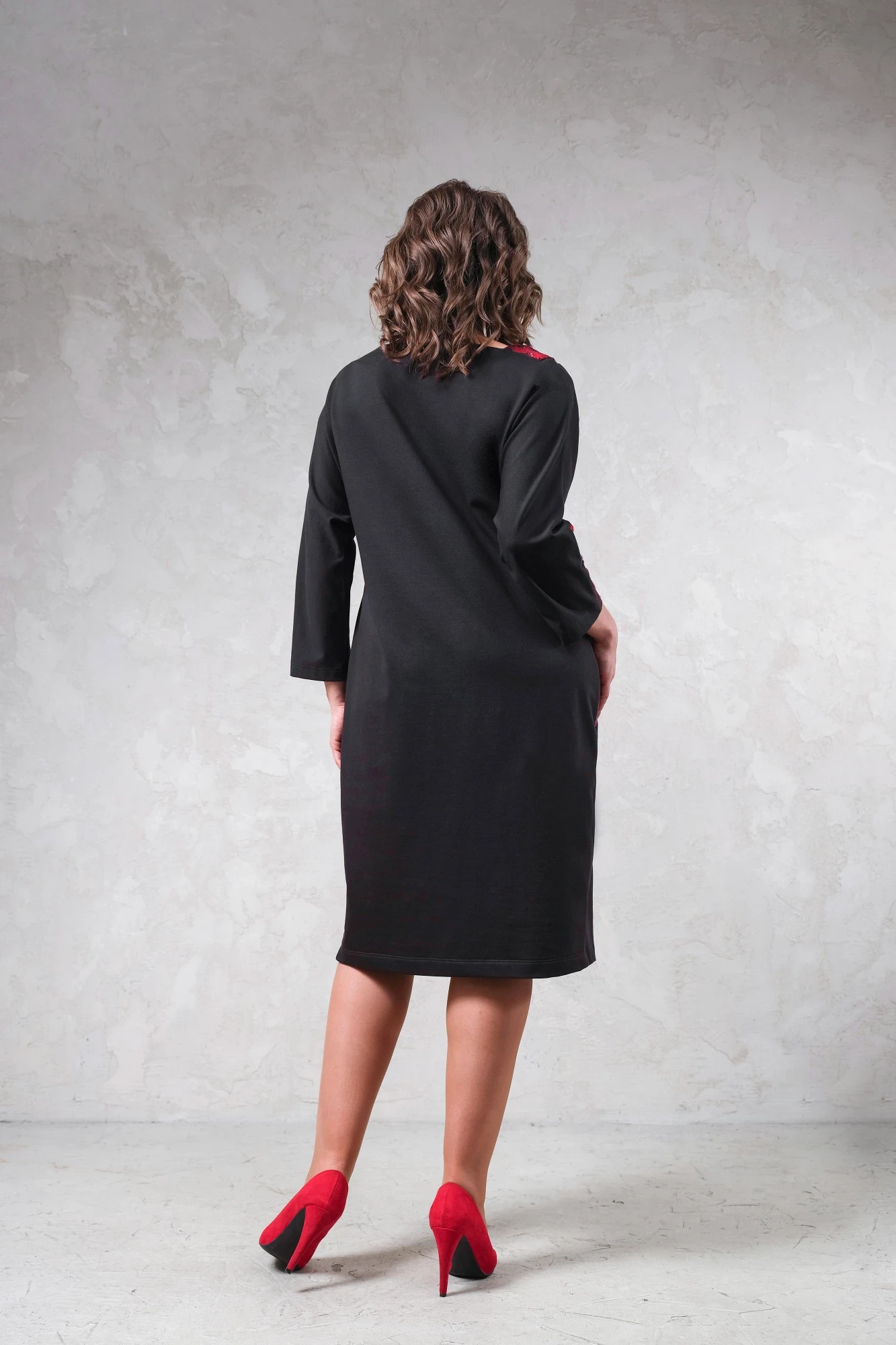 Эффектное нарядное платье полуприлегающего силуэта с ассиметричным вырезом и вставками из гипюра с пайетками. Рукава - "летучая мышь", длиной 7/8. Платье длиной едва за колено.