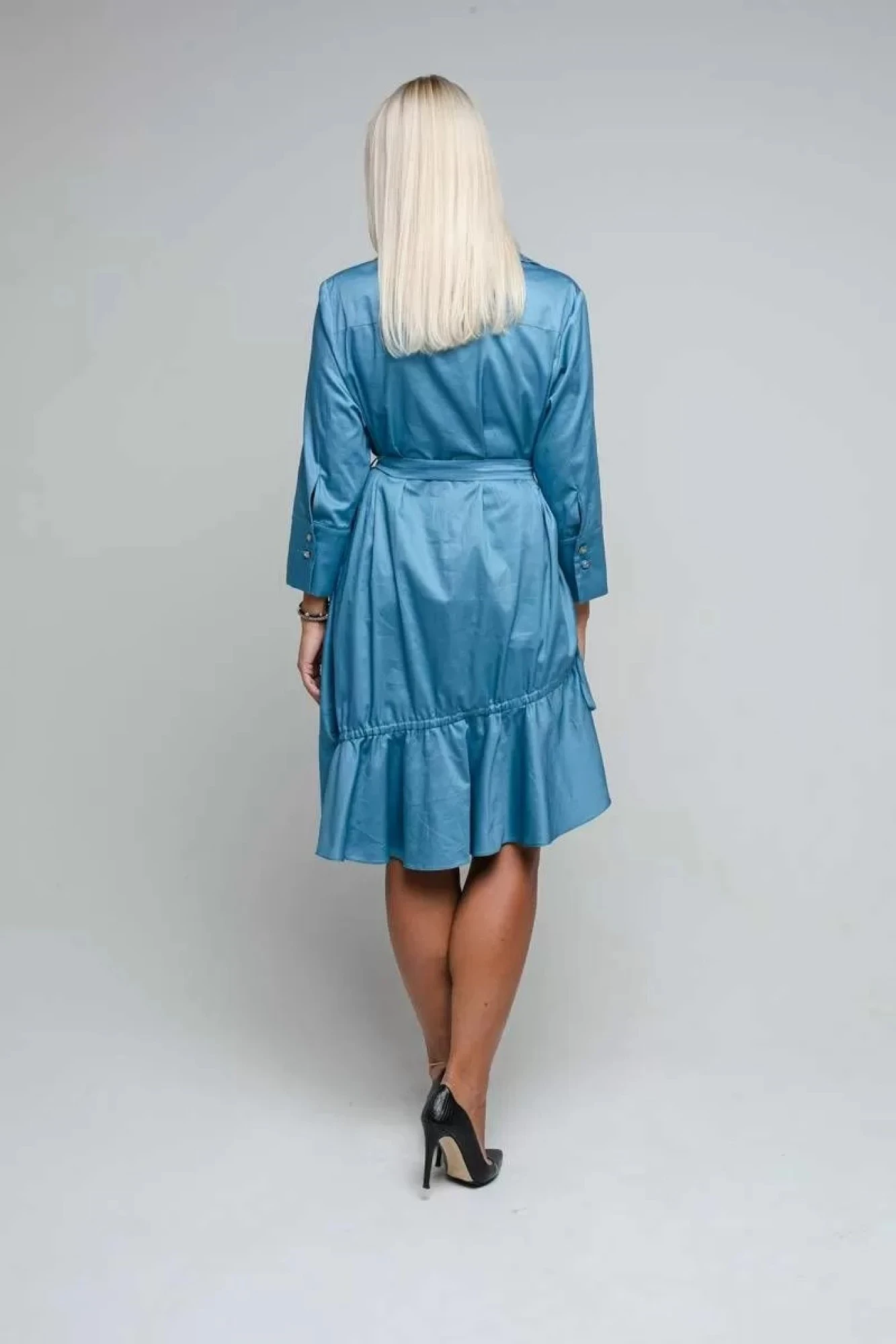 Универсальное платье из хлопковой ткани, подойдет как для повседневных образов, так и для праздничных выходов. Рубашечный воротник, застежка в виде планки на пуговицах, рукав втачной на широком манжете с застежкой, низ асимметричный на сборке, в боковом шве карман.