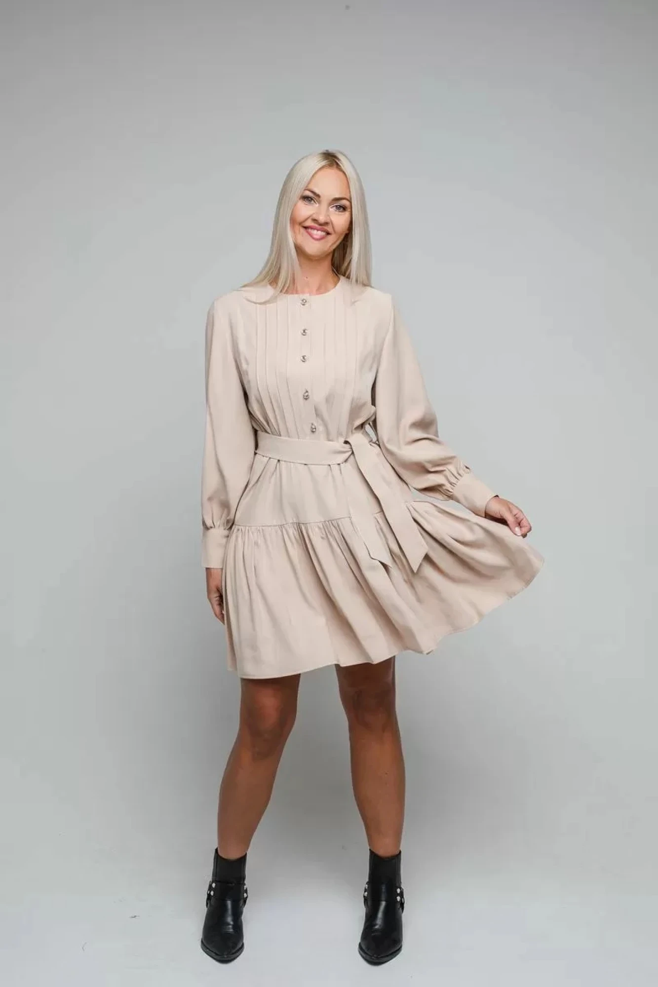Стильное платье подойдет как для торжественных событий, так и для создания ежедневных луков, горловина округлой формы, длинный рукав, застежка на планке на пуговицах, с поясом.