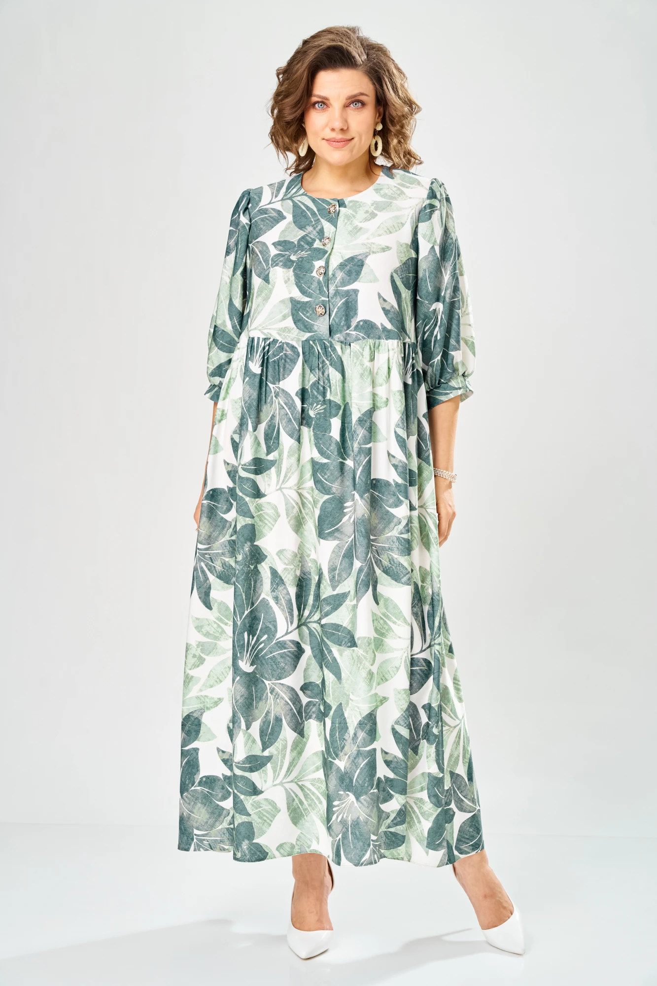 Платье со слегка завышенной линией талии. Лиф платья выполнен с застежкой на петли-пуговицы. Рукав втачной одношовный, со сборкой по линии оката, низ рукава оформлен манжетой.