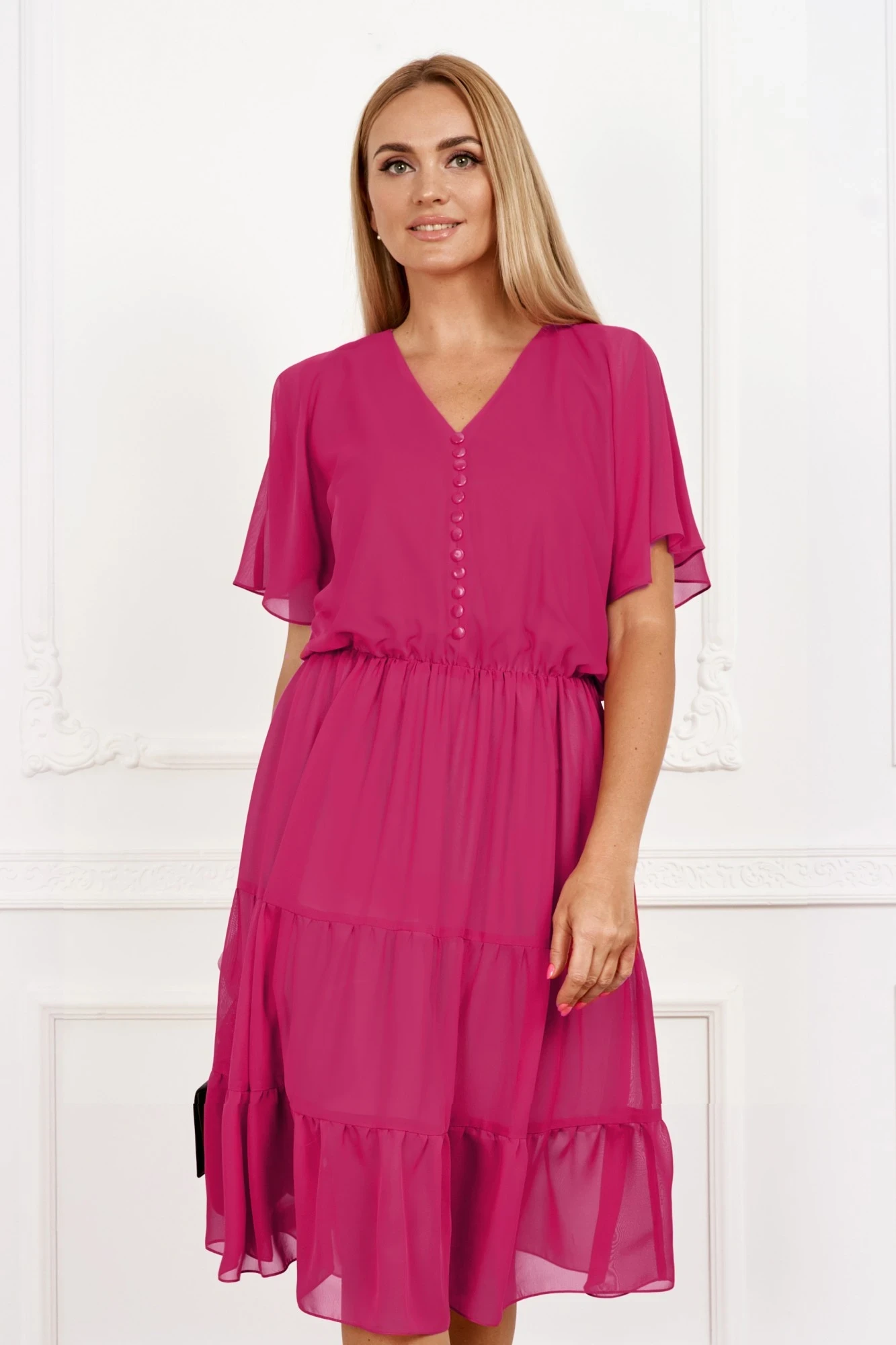 Платье женское из шифоновой ткани, вырез горловины v-образный, рукав спущенный, цельнокроёный, по линии талии эластичная тесьма, изделие на подкладке.