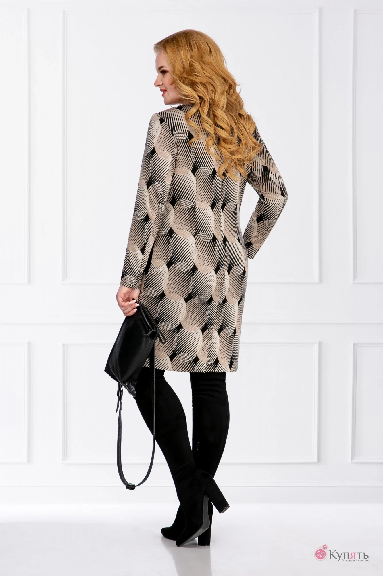 Платье женское полуприлегающего силуэта выполнено из трикотажного полотна. Горловина круглая, рукава втачные двухшовные.​ По переду выполнены нагрудные вытачки. По спинке обработан средний шов со шлицей и талиевые вытачки. В боковых швах обработаны действующие карманы. В качестве декора в комплекте идёт брошь. Фурнитура может меняться.​