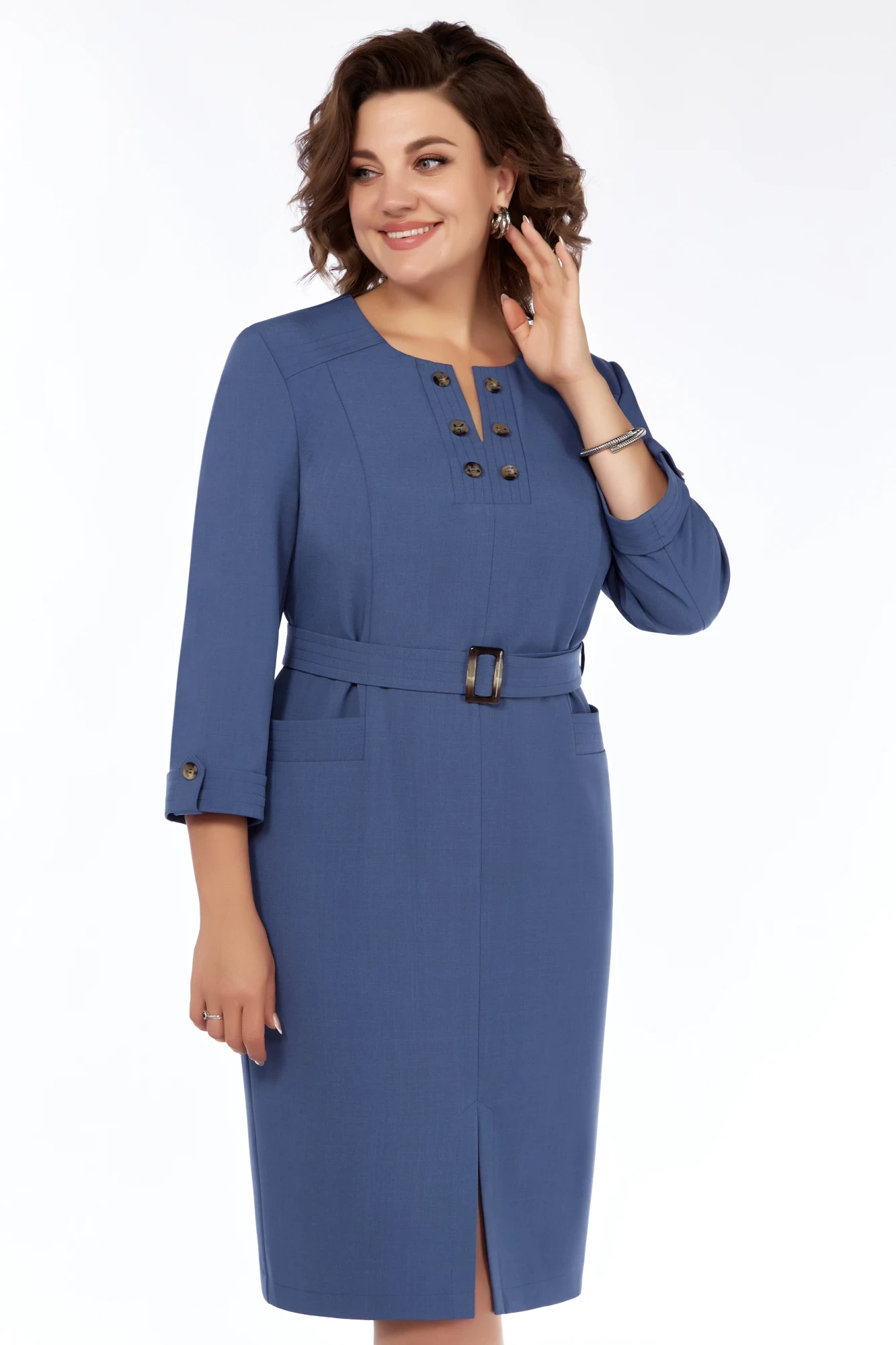Женское стильное платье полуприлегающего силуэта выполнено из плательно-костюмной ткани.Перед со средним швом, заканчивающимся разрезом,кокетками и рельефами от них до бокового шва,в шве выполнены карманы с листочкой.Круглый вырез горловины с планками и декоративными пуговицами по переду.Спинка со средним швом и талиевыми вытачками.Рукава втачные двухшовные длинной 3/4,низ на притачных отложных манжетах с патами и декоративными пуговицами.Платье укомплектовано поясом , выполненным из основной ткани с декоративной пряжкой в цвет пуговиц .Пояс,кокетки,планки,листочки и манжеты отсрочены декоративными строчками.