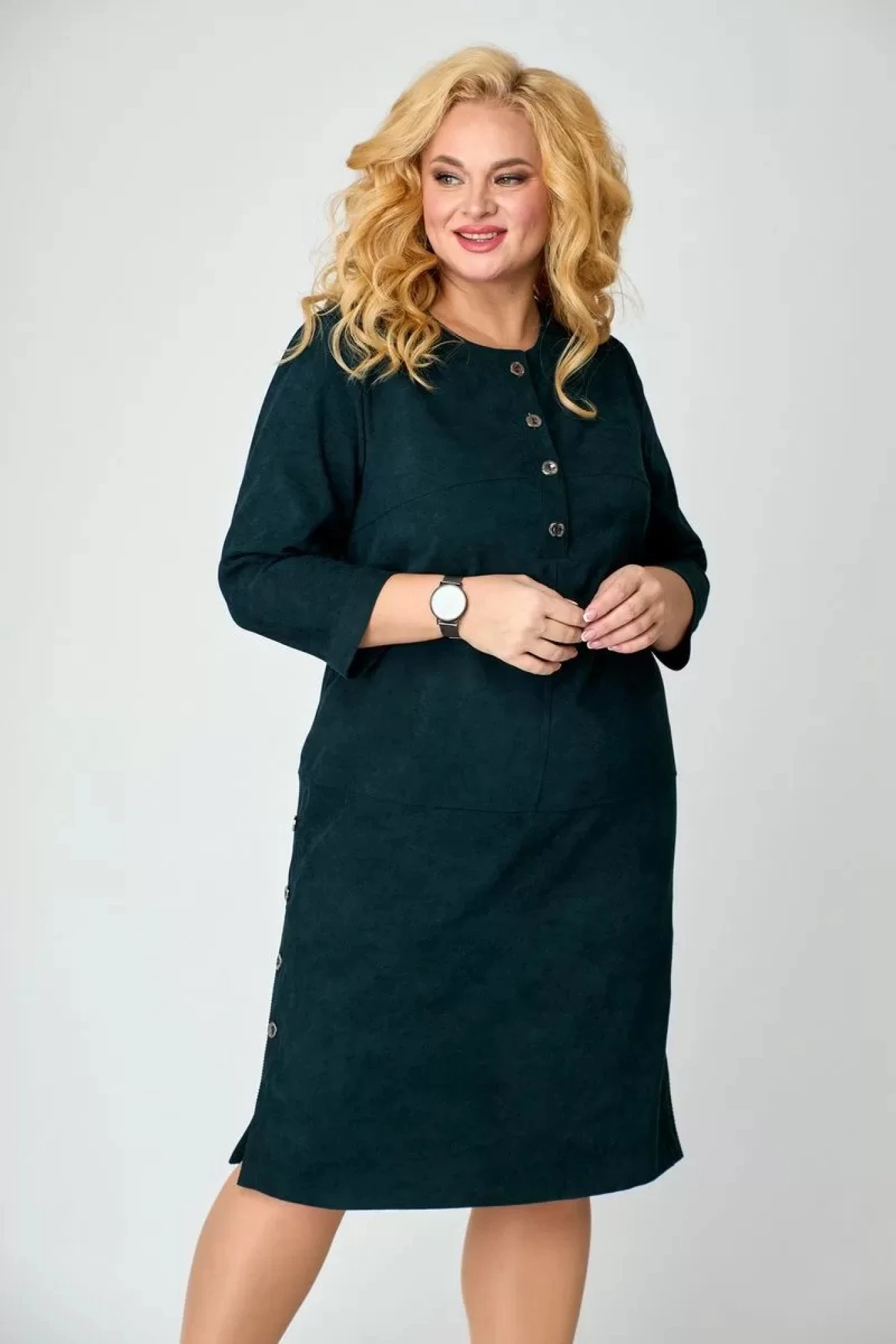 У платья красивый тёмно-зелёный цвет, размер в размер, ткань средней плотности.