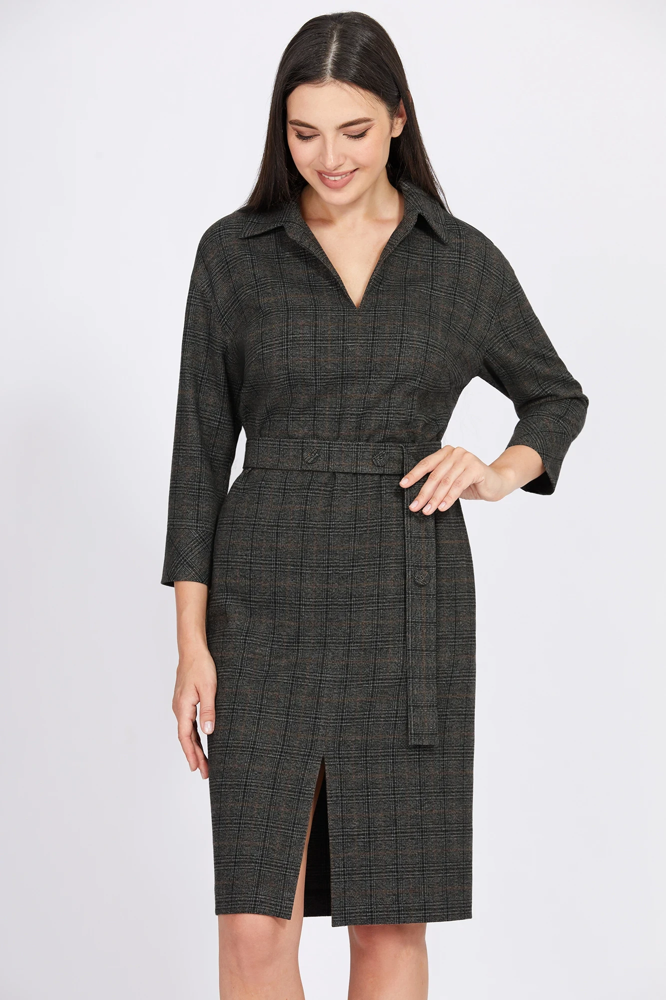 Универсальное, стильное, шикарное - это платье прямого силуэта, выполненное из приятной ткани с добавлением вискозы и ненавязчивым клетчатым рисунком, имеет всё, что вы могли пожелать: элегантный воротник с цельнокроёной стойкой, переходящий в сдержанный вырез; спущенная линия плеч с притачными рукавами с манжетами; функциональные карманы в боковых швах; интересный пояс в тон, красиво подчёркивающий талию и разрез спереди, добавляющий модели динамичности.
