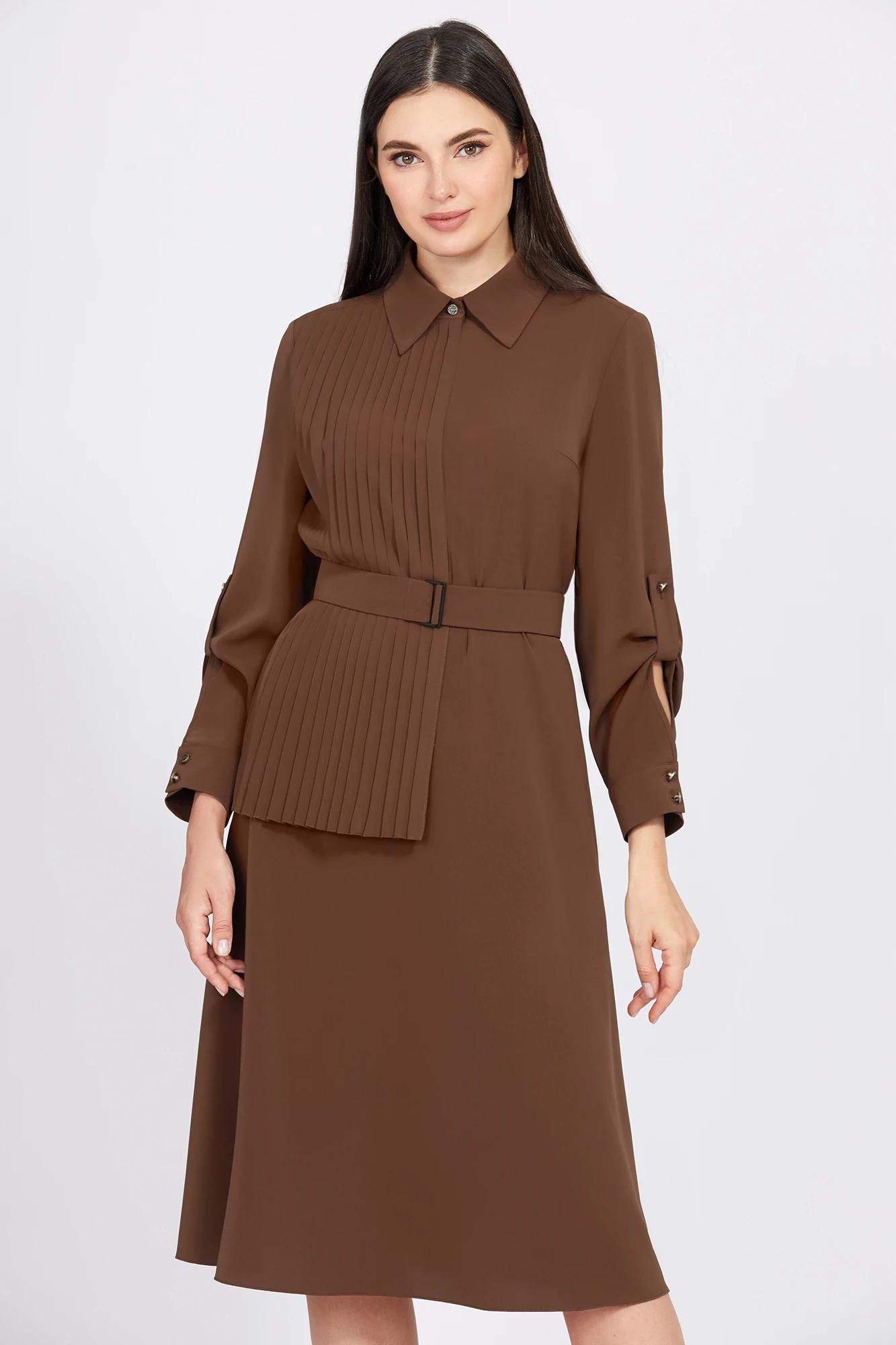 Лёгкое, струящееся платье X-образного силуэта длины миди, с интересным кроем рукавов и рубашечным воротником на стойке, выполнили из приятной, однотонной ткани. Лиф переда платья с застёжкой на петли и пуговицы дополнили отделочной деталью со складками на одно плечо. Линию талии красиво подчёркивает пояс в тон с контрастными пряжками.