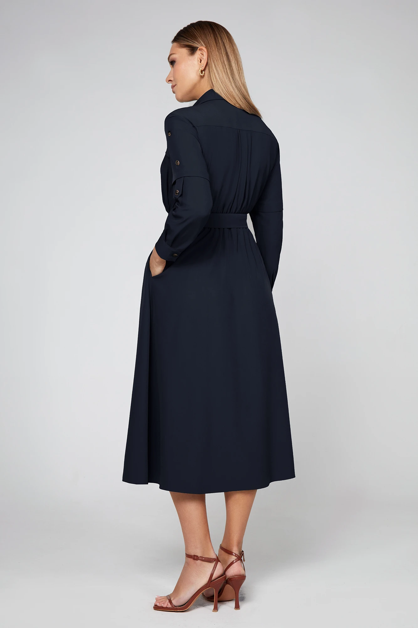 Стильное платье-рубашка с длинным рукавом и расклешенным кроем — идеальное сочетание легкости и элегантности. Модель со спущенной линией плеч выполнена из приятной вискозной испанской ткани и дополнена интересными элементами, придающими ей спортивный и динамичный характер. Отложной воротник и планка на пуговицах добавляют очарования, а рукава с манжетами можно закатать и зафиксировать при помощи паты и пуговицы, для создания непринужденного образа. Вертикальные складки , декоративные планки по юбке платья и отделочные пуговицы подчеркивают оригинальность этой модели, а карманы в боковых швах добавляют функциональности. Скрытая резинка на талии обеспечивает удобную посадку по фигуре, а пояс в тон с D-пряжками красиво подчеркивает талию