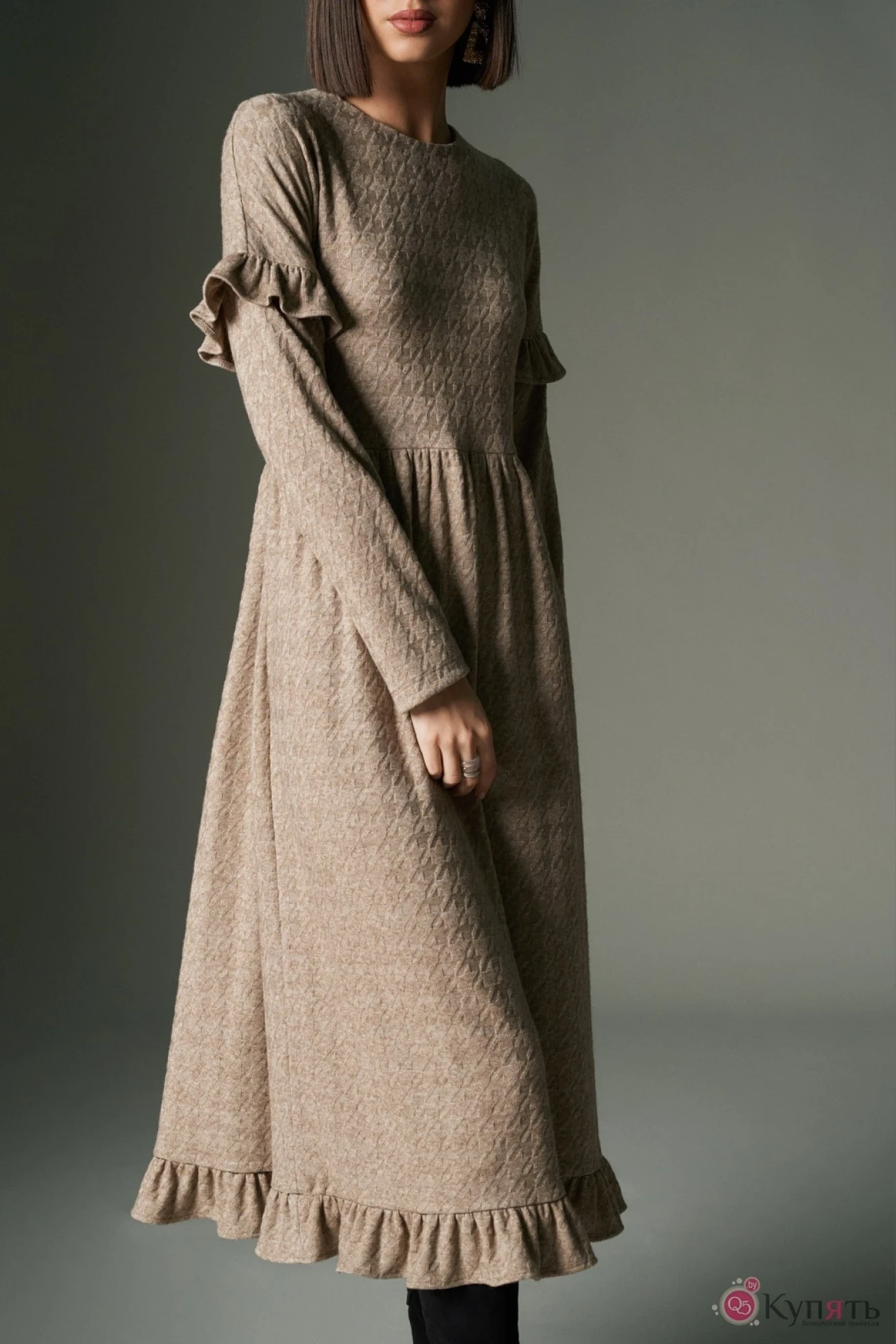 Платье женское из трикотажного полотна, отрезное выше линии талии, с рукавом со спущенным плечом. Рукав украшен нашитой рюшей. Горловина овальная на обтачке. В среднем шве спинки потайная тесьма молния. По низу изделия нашита рюша.