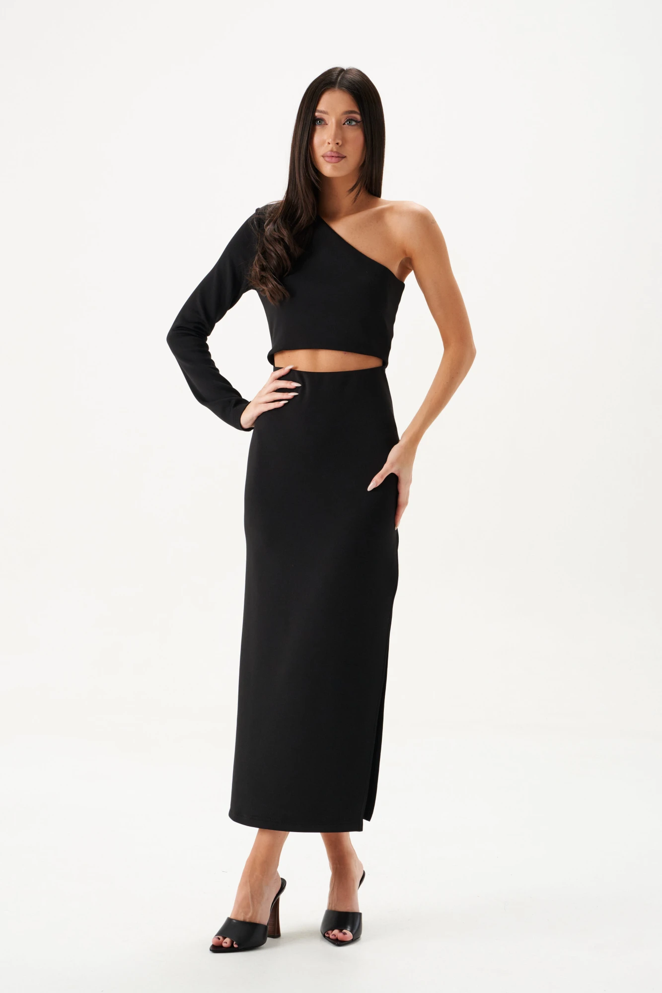 Платье на одно плечо выполнено из трикотажа черного цвета. Характеристка: платье на одно плечо с фигурным разрезом на талии по переду изделия, разрез по бокову шву - 63см. Длина рукава от края горловины - 74см, длина платья по спинке от плеча 132см.