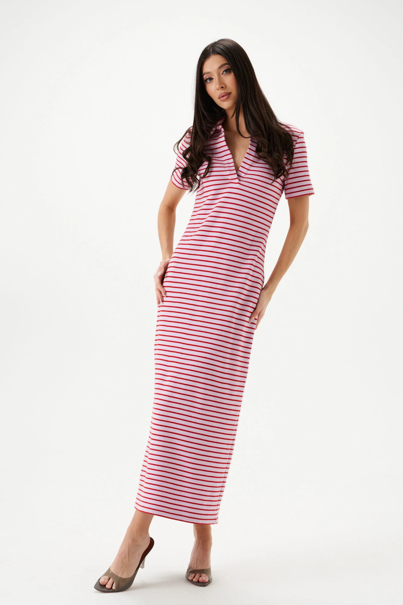 Платье-макси. Выполнено из трикотажного полотна. Полуприлегающий силуэт. Воротник отложной. Горловина – поло. Рукав втачной. Длина рукава 22 см. Длина спинки 135 см