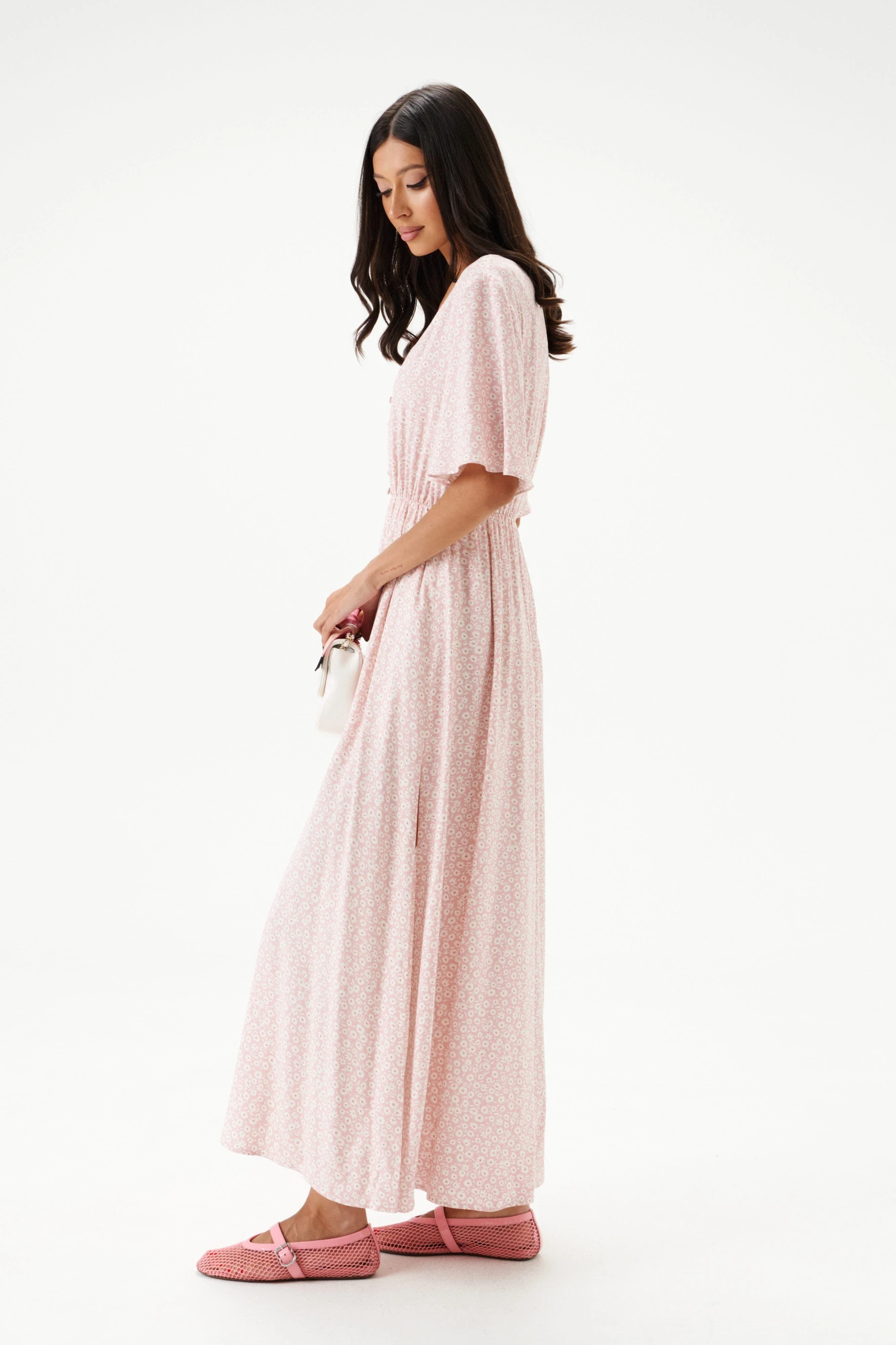 Платье полуприлегающего силуэта выполнено из нежно-розовой ткани с цветочным принтом.Характеристики: полуприлегающий силуэт, отрезное, отрез на резинке, V-образный вырез горловины, застежка - петли пуговички по передней части изделия, до отреза, пуговицы декорированы тканью основного изделия. Рукав втачной, короткий, свободного кроя. В боковых швах, по низу изделия разрезы.Подкладка до уровня разрезов. Длина по спинке 133 см, длина рукава 27 см