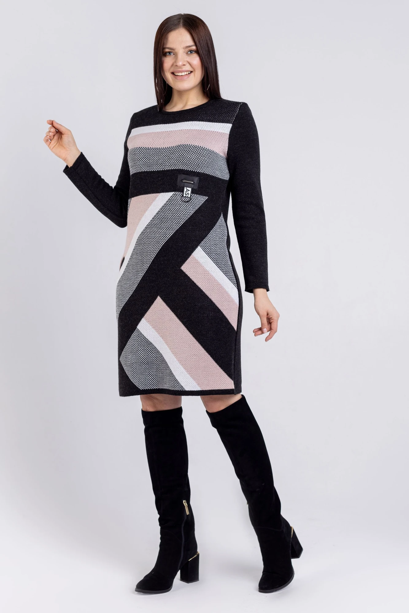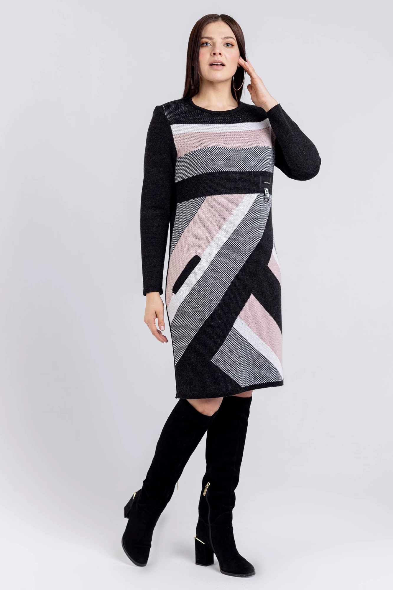 Платье теплое офисное представляет собой идеальный выбор для женщин, ищущих комфорт и стиль в повседневной рабочей одежде. Это вязаное платье с длинными рукавами и прорезными карманами, предлагающее уют и практичность. Без застежки и с базовыми декоративными элементами, оно подходит для офисного образа. Платье миди обеспечивает универсальность и удобство. Геометрический рисунок добавляет интерес к простому дизайну, делая это платье отличным выбором для повседневного ношения. Подходит на рост 164-170 см