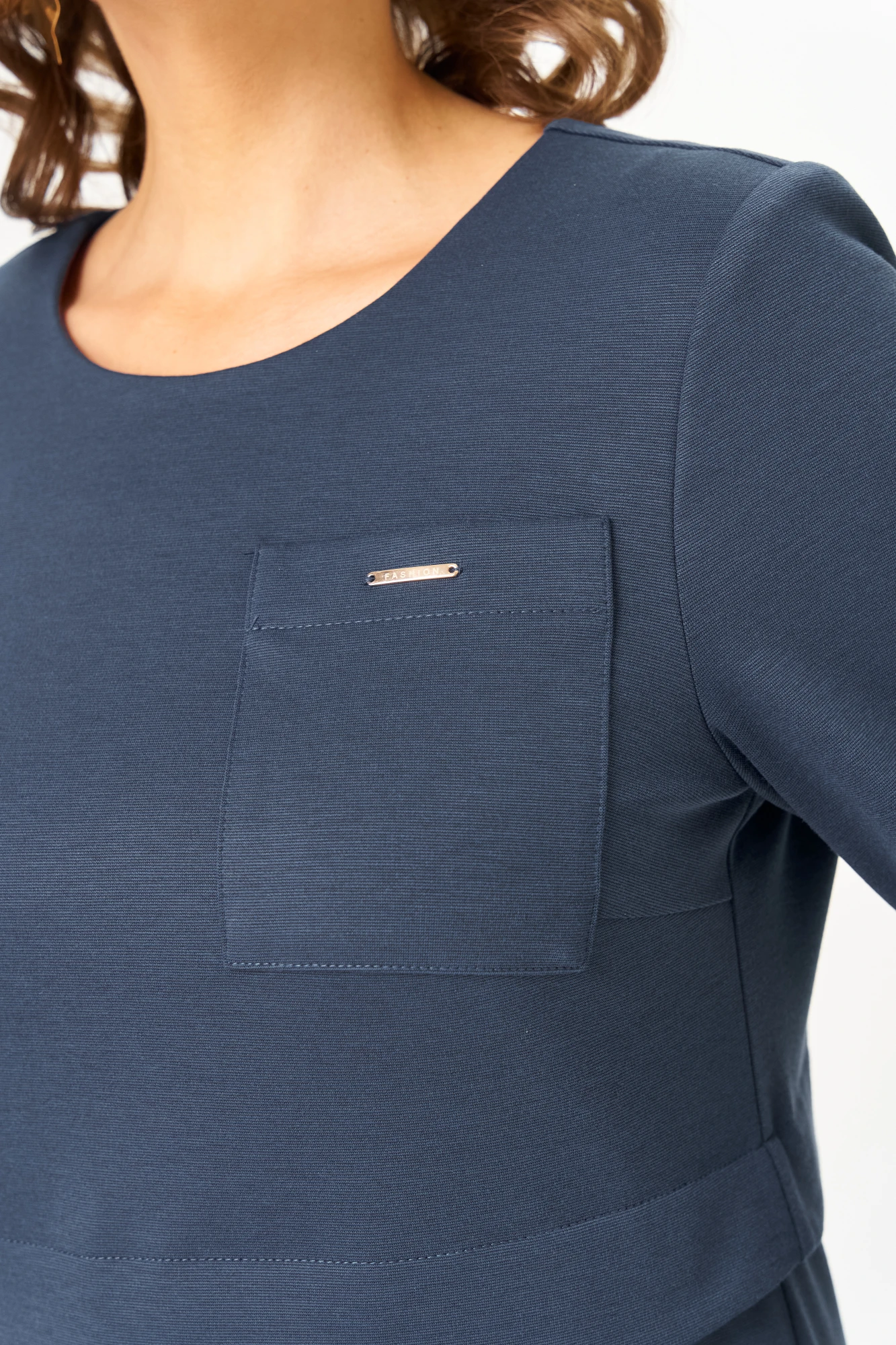 По левой стороне переда на уровне груди накладной карман с пришивной брошкой, горловина круглая, талия собрана на кулису.