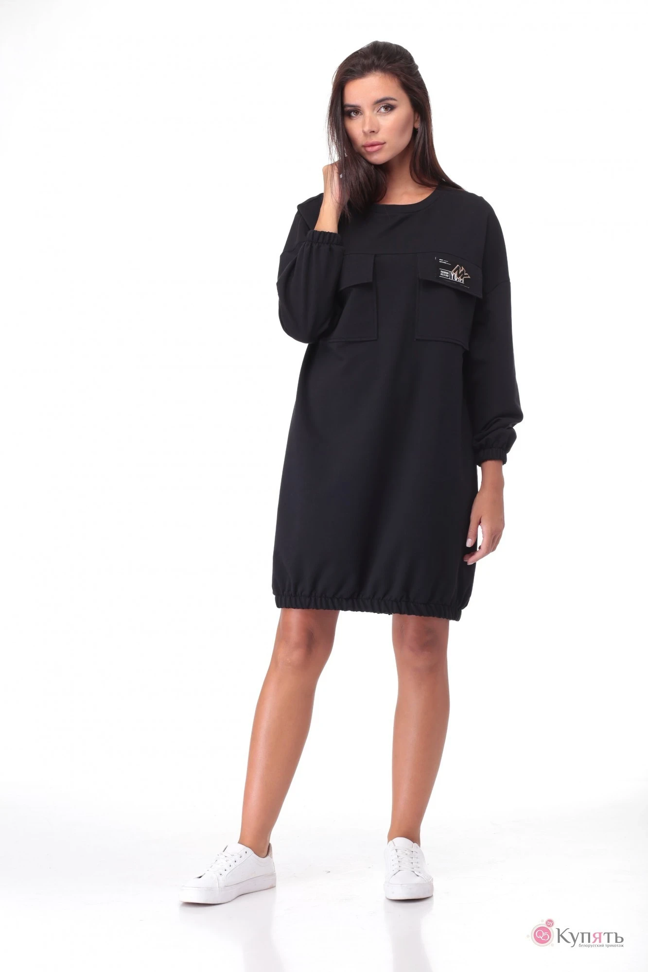 Перед платья с кокеткой. На уровне груди расположены накладные карманы. В шве кокетки над карманами обработаныклапаны.На левом клапане расположена нашивка.