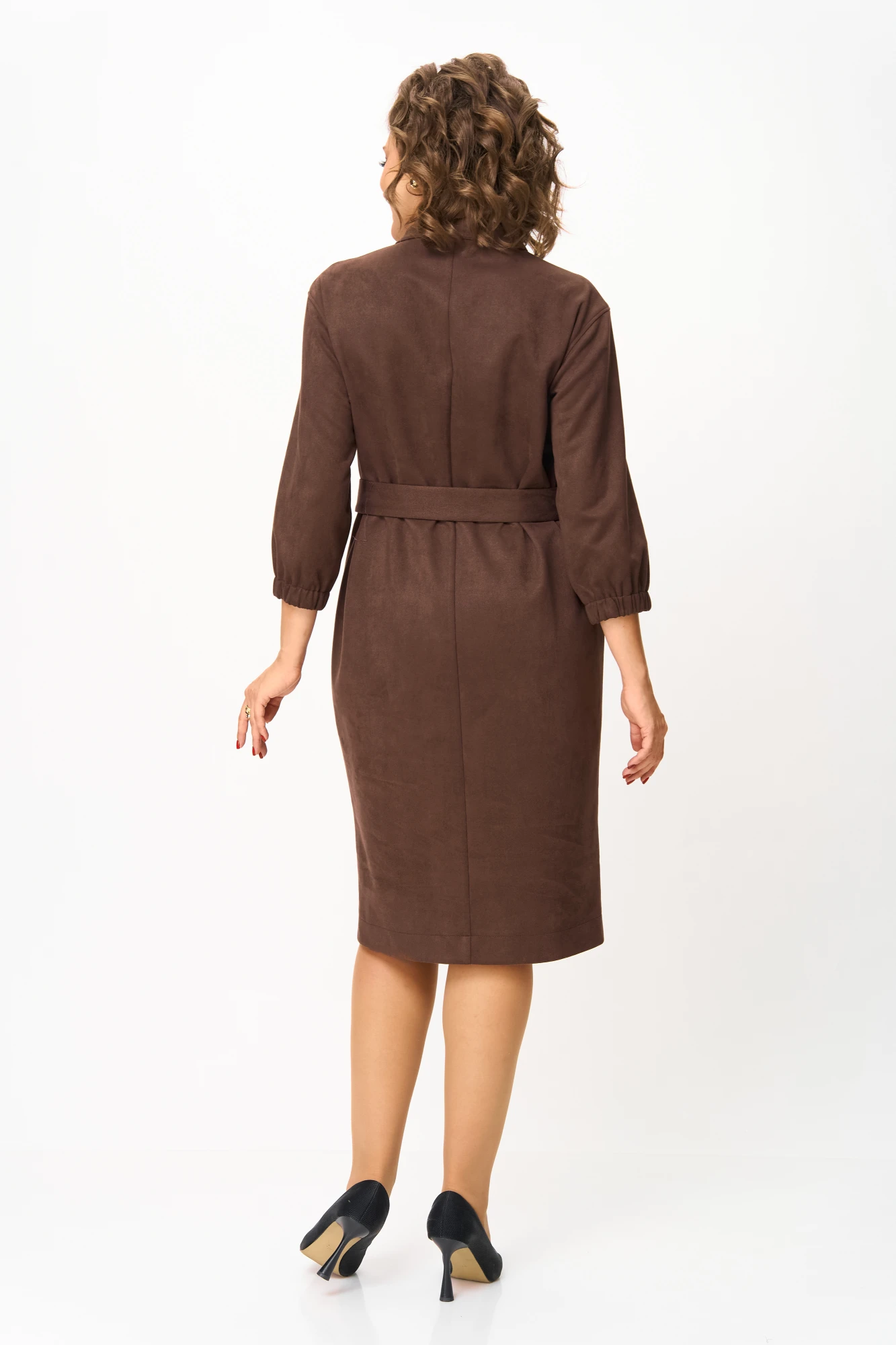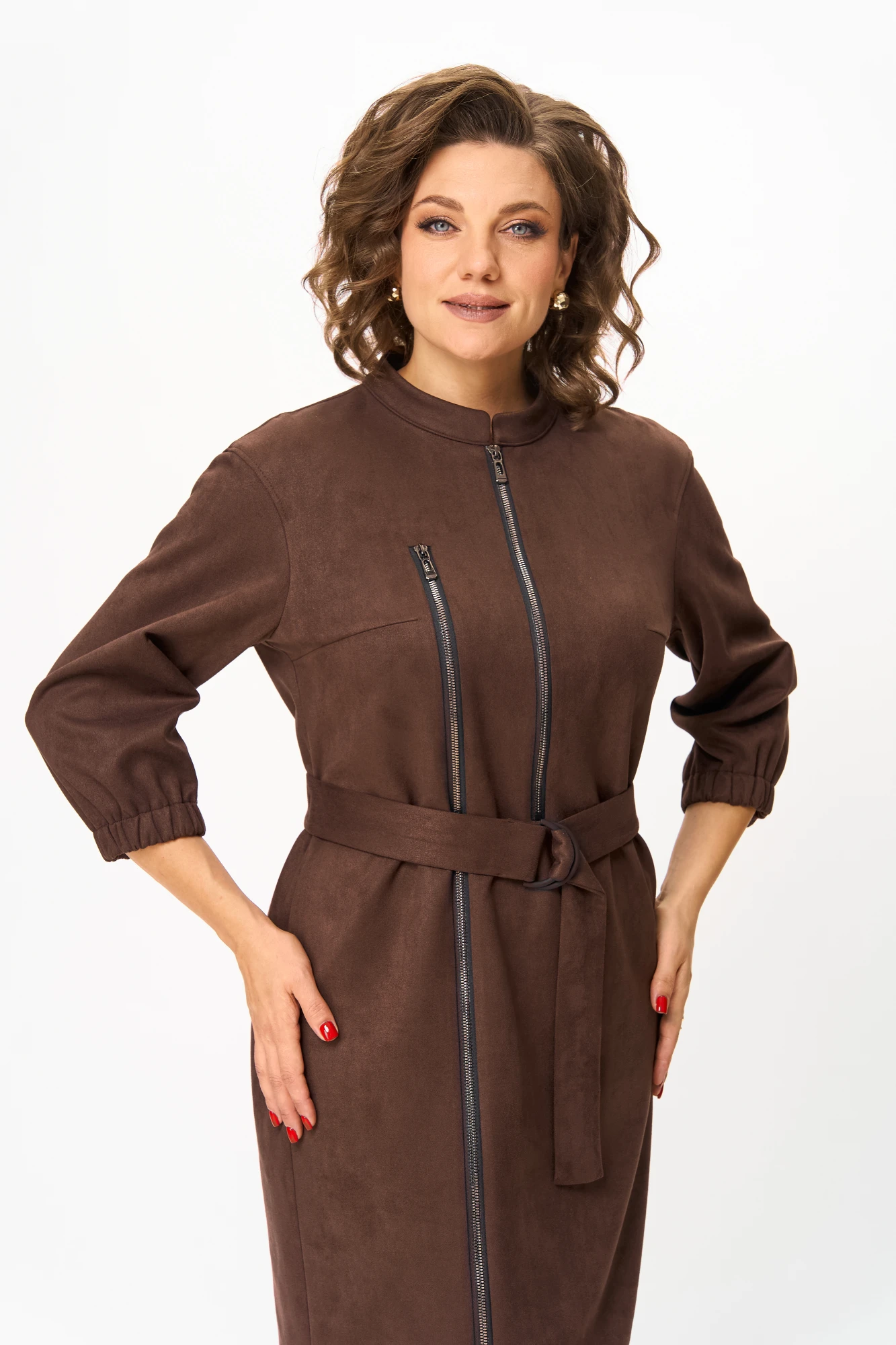 Платье полуприлегающего силуэта. По переду платье декорировано двумя рядами молнии. Горловина оформлена воротником стойка, в боковых швах на уровне бедер карманы. Спинка с центральным швом. Линия плеча спущена. Рукава втачные, длина ¾, низ на резинке.