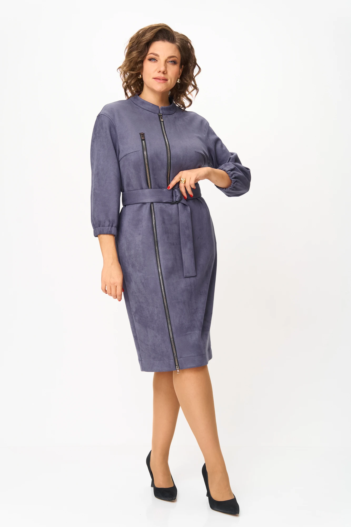 Платье полуприлегающего силуэта. По переду платье декорировано двумя рядами молнии. Горловина оформлена воротником стойка, в боковых швах на уровне бедер карманы. Спинка с центральным швом. Линия плеча спущена. Рукава втачные, длина ¾, низ на резинке.
