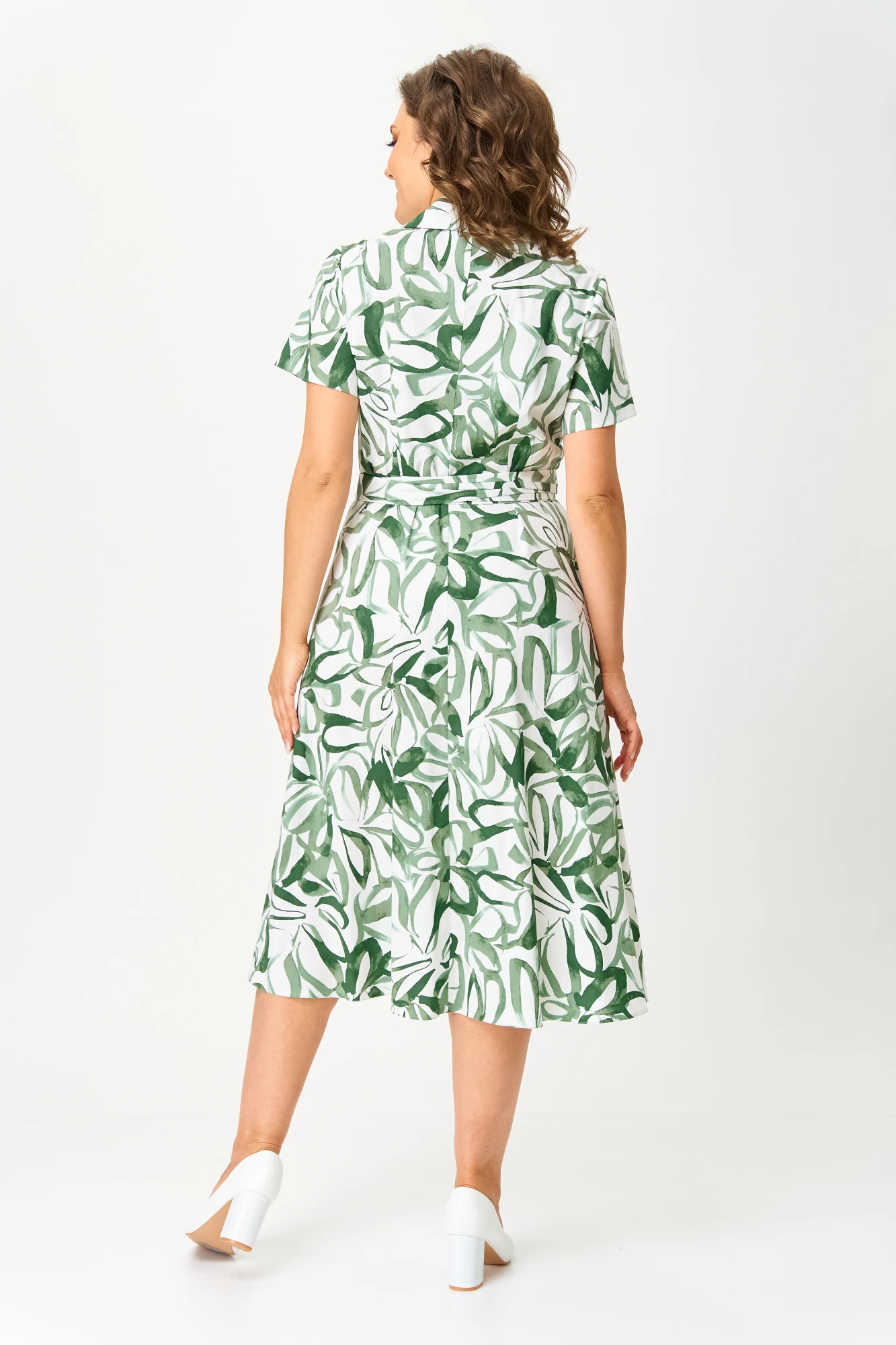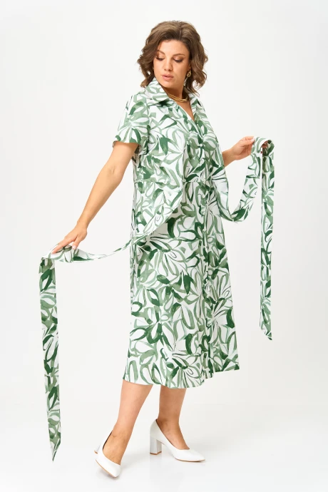 Платье полуприлегающего силуэта с широкой юбкой, отрезное по линии талии, по лифу цельновыкроенный пояс. Горловина «V» образная, застежка на петли пуговицы.