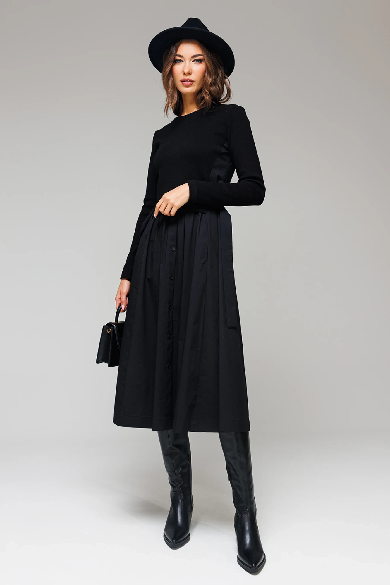 Платье полуприлегающего силуэта, отрезное по линии талии, комбинированное из трикотажа и текстиля. Рукав втачной одношовный трикотажный. По переду и спинке рельефы. П переду нашивка BUTER, на нижней части карманы в рельефах, имитация центральной застежки на петли-пуговицы. С поясом от рельефом с застежкой на полуколцах. Длина миди.