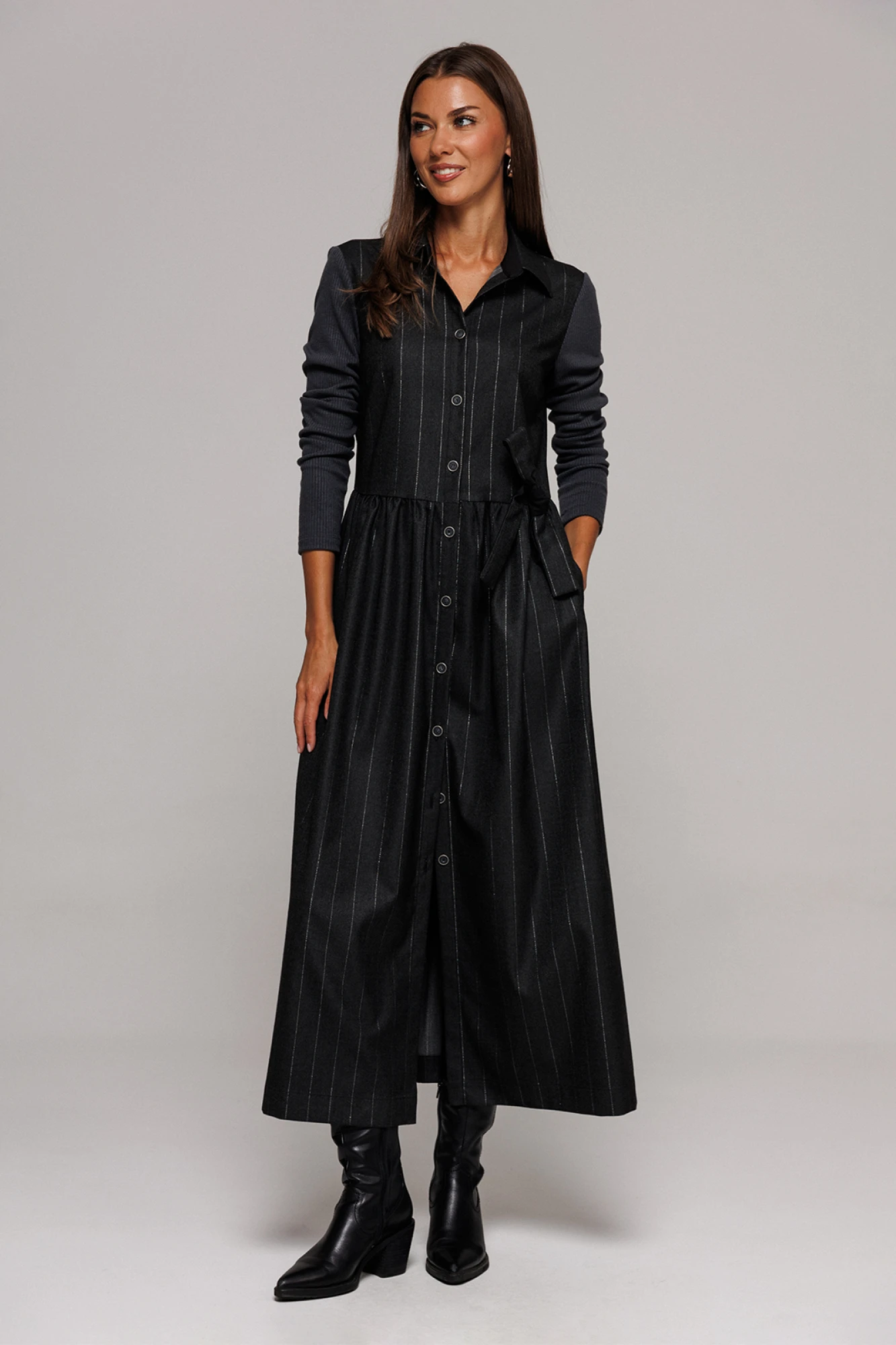 Платье длинное из костюмной ткани в полоску из люрекса с втачным длинным одношовным трикотажным рукавом. Полочка с центральной застежкой на петли пуговицы и с нагрудными вытачками. По спинке нашивка "BUTER". Платье отрезное по линии талии и со сборкой по шву притачивания низа. Воротник рубашечный отложной на стойке. По линии талии бант из основной ткани. Платье без подкладки.
