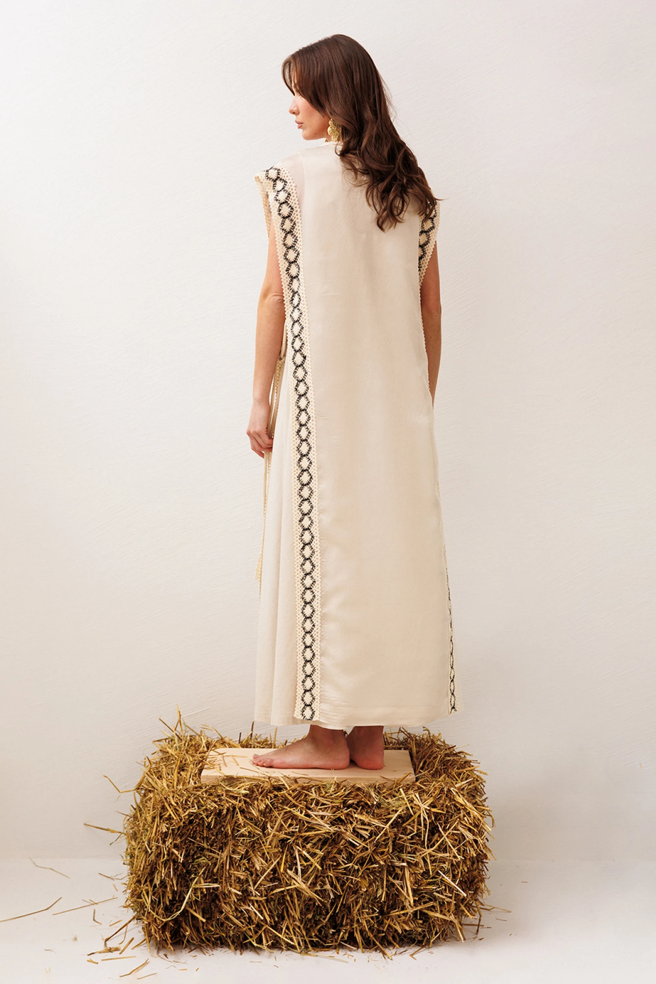 Платье длинное, состоящие их верхнего и нижнего. Верхнее платье из полупрозрачной ткани, слегка расклешенное к низу без рукавов. По бокам платье не стачено с завязкой на декоративный шнурок. По всей длине полочки и спинки по бокам настрочено кружево. Горловина округлая с притаченым к ней кружевом. По спинке вырез капля с застежкой на навесную петлю-пуговицу. Нижнее платье А-силуэта без рукавов, с карманами в боковых швах. Вырез горловины – округлый.