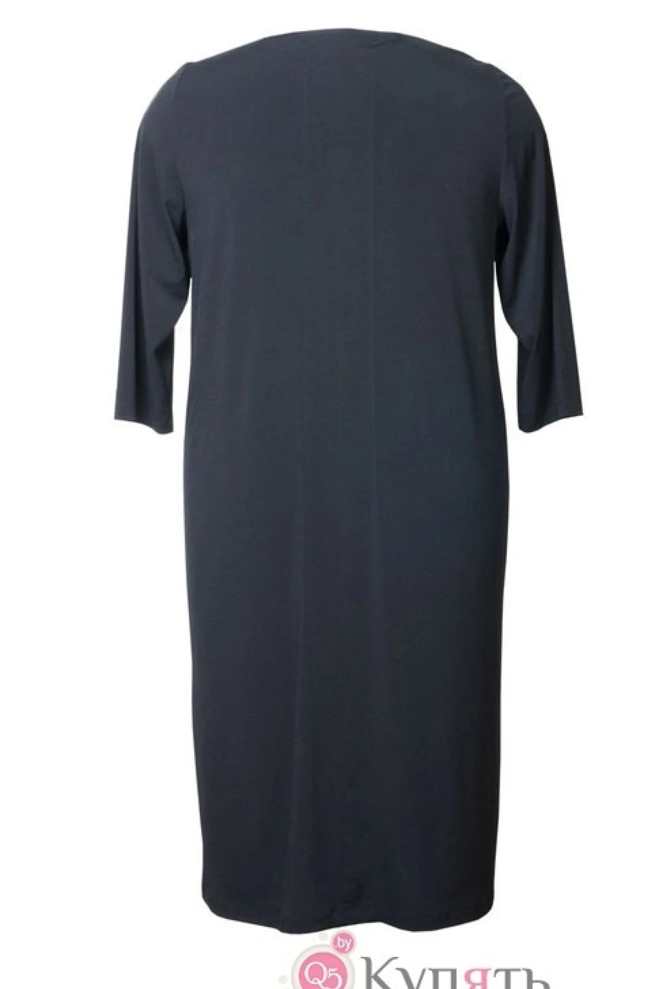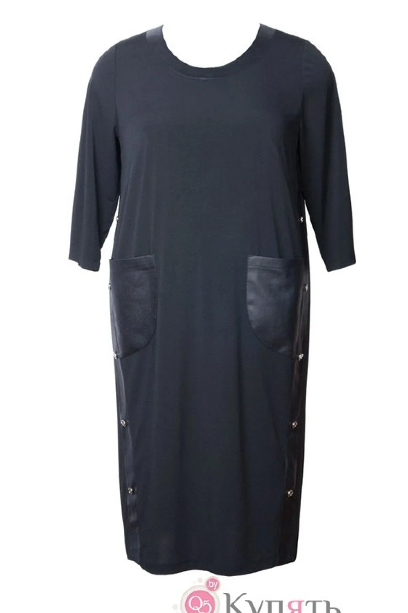 Отличный вариант повседневного платья, прямого силуэта с втачными рукавами ¾. Перед с отделочными притачными планками и накладными карманами из трикотажного полотна под кожу. Спинка со средним швом. Притачные планки декорированы пуговицами.