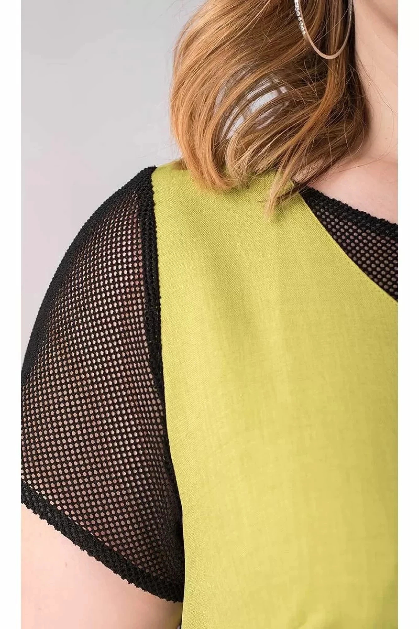 Спортивный крой и рукава из ткани-сетки этого платья делают его объектом желания для энергичных дам. Настроченная тесьма по боковым швам маскирует карманы, а круглая брошь-аппликация на груди также является громким акцентом. Надевая это платье, предпочтение лучше отдать кедам, чем каблукам.