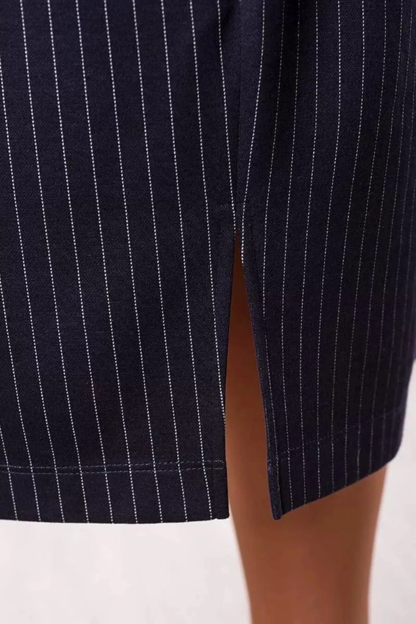 Универсальное трикотажное платье должно быть в гардеробе каждой модницы. Наше стильное платье отлично подойдет для работы, офиса, деловых и дружеских встреч, прогулок и свиданий. Платье полуприлегающее, вертикальная полоска зрительно вытягивает фигуру и придает силуэту стройности и утонченности. Оригинальная горловина, нашивка на груди делают образ нескучным. Обратите внимание, что платье хорошо сядет на фигуре, у которой объем груди меньше, чем объем бедер примерно 8 см.