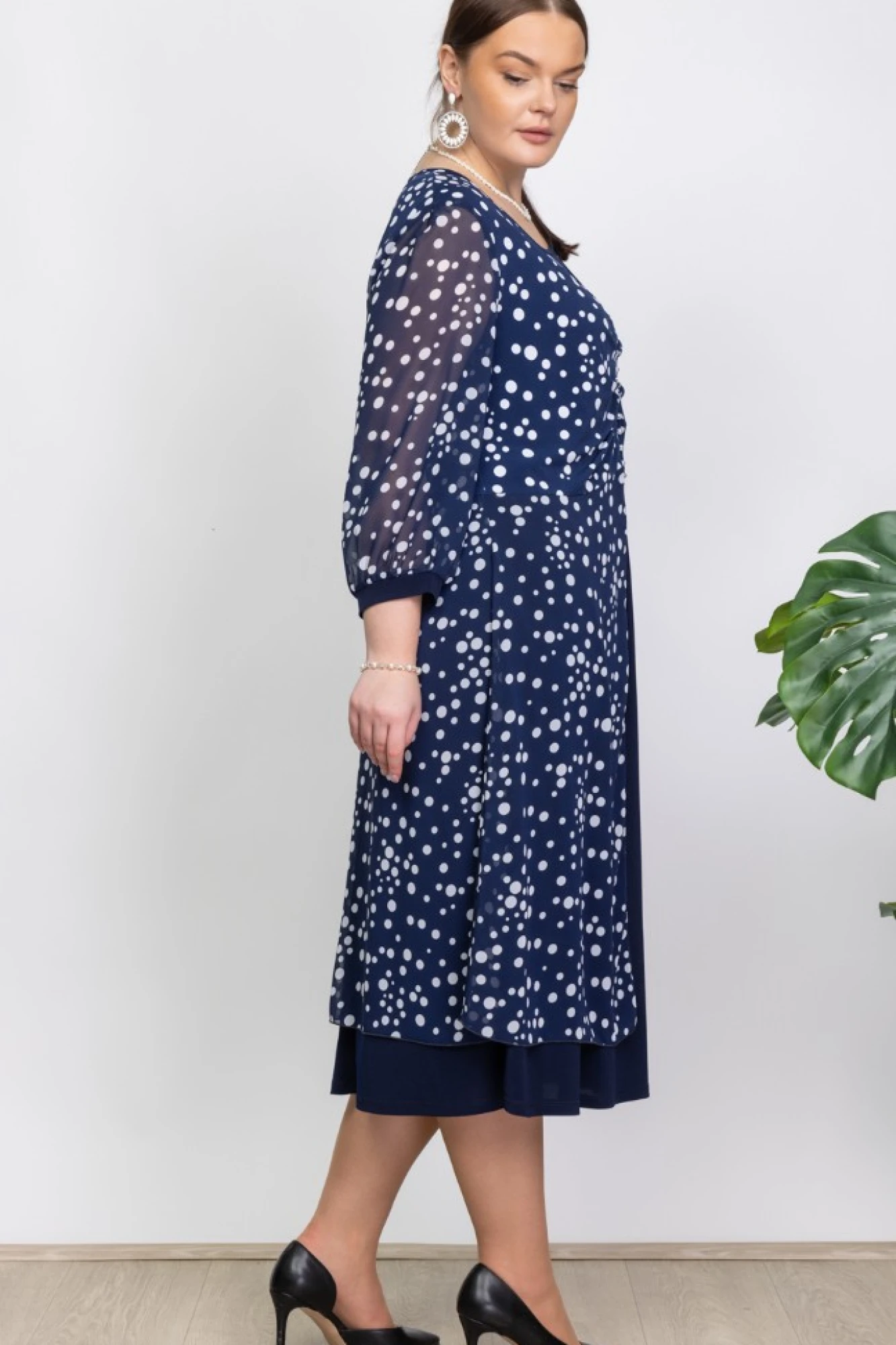 Восхитительное нарядное платье для женщин большого размера. Верхнее платье силуэта трапеция выполнено из шифона, нижнее из качественного трикотажа. Перед платья украшен жемчужинами, которые имитируют застежку и создают романтичный и привлекательный образ.