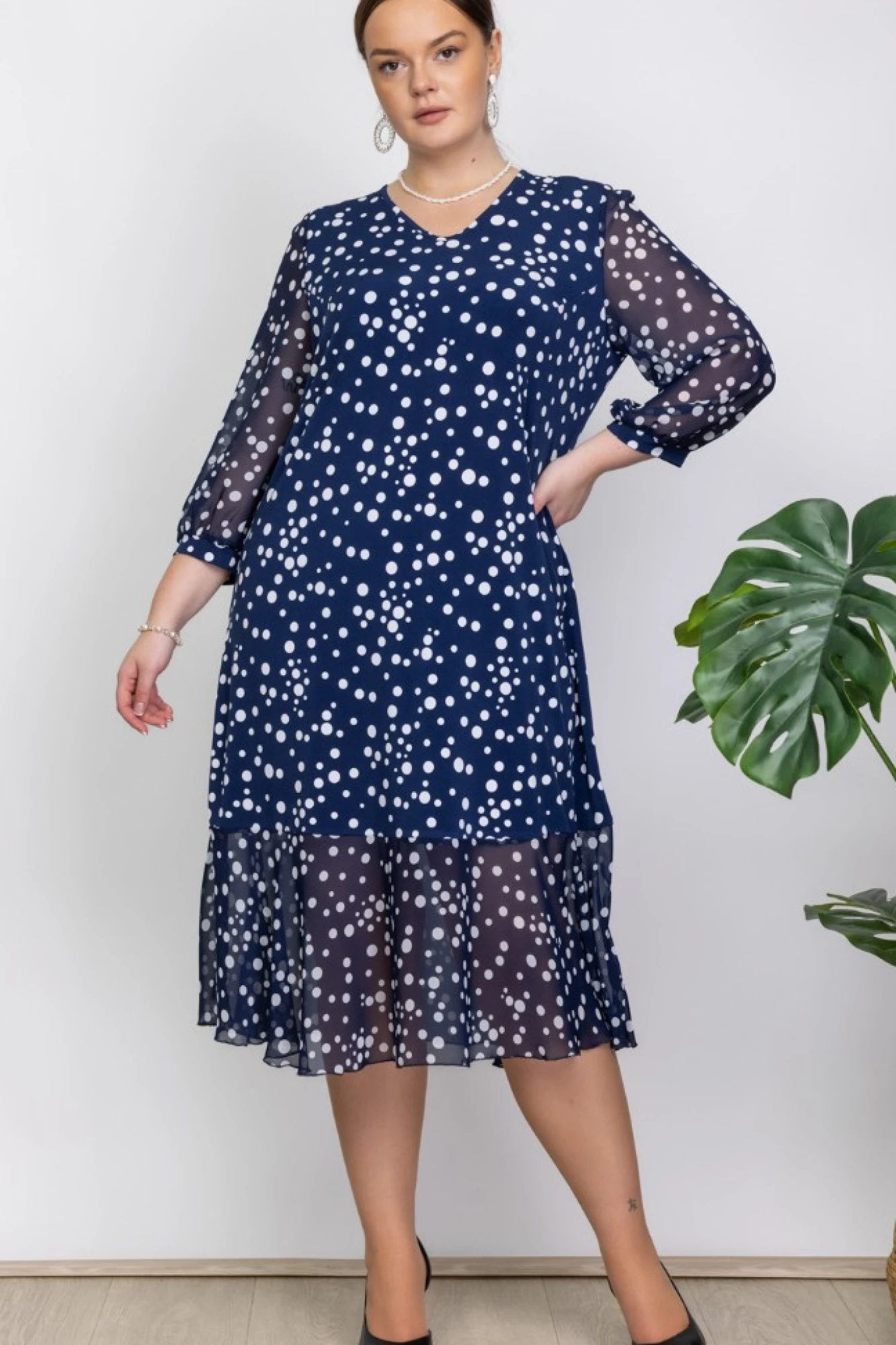 Восхитительное нарядное платье, расклешенное книзу с воланом из шифона. Рукава платья также выполнены из шифона. Невероятно женственная модель для женщин большого размера. Платье универсальное – и в пир, и в мир. Отлично подходит для торжественных и праздничных мероприятий, свадеб, вечеринок.