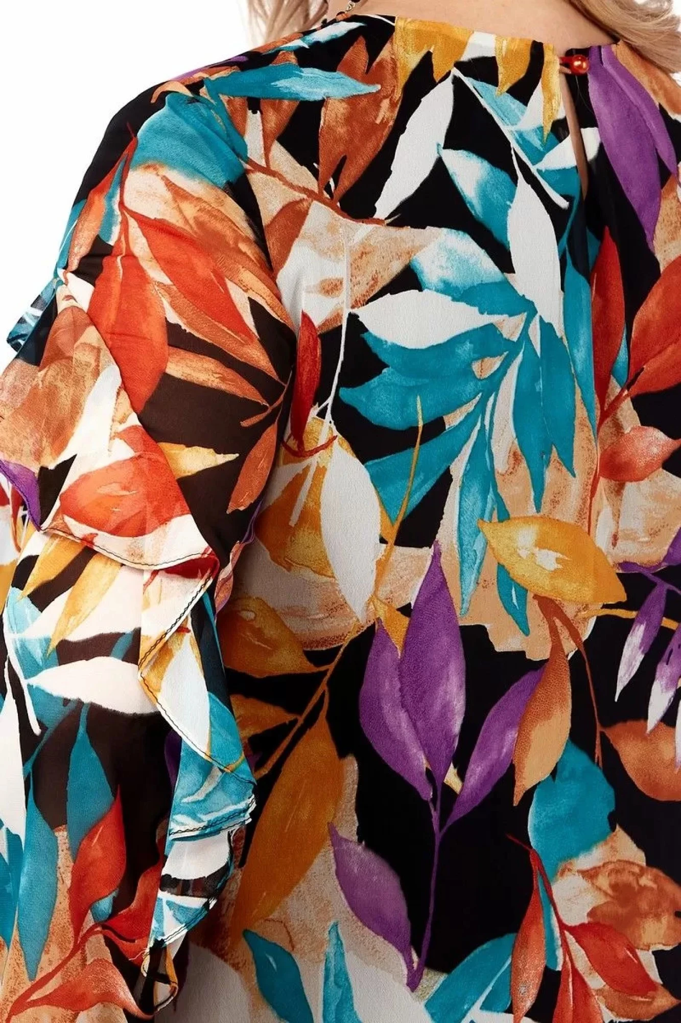 По полочке обработана кокетка, в которую вставлен притачной волан, переходящий на рукав. Спинка цельная. На спинке застежка на петлю и пуговицу. Рукав втачной одношовный, низ рукава на резинке. Платье на текстильной вискозной подкладке.