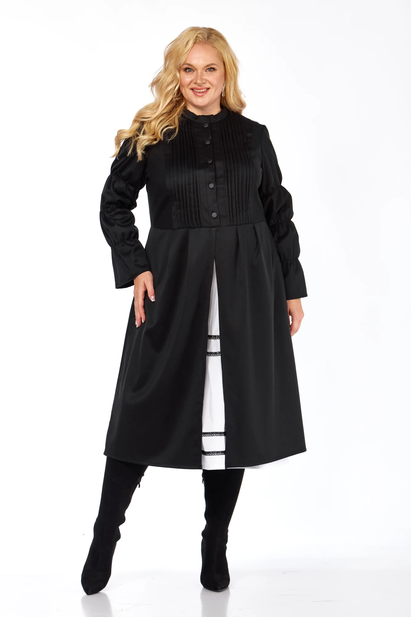 Приталенный силуэт с акцентом на талии достигается за счет призборенной спинки, обеспечивающей идеальную посадку по фигуре. Одношовный вточной рукав длиной 62 см завершается поперечной сборкой, создавая легкий и романтичный объем. Длина платья по спинке – 114 см.